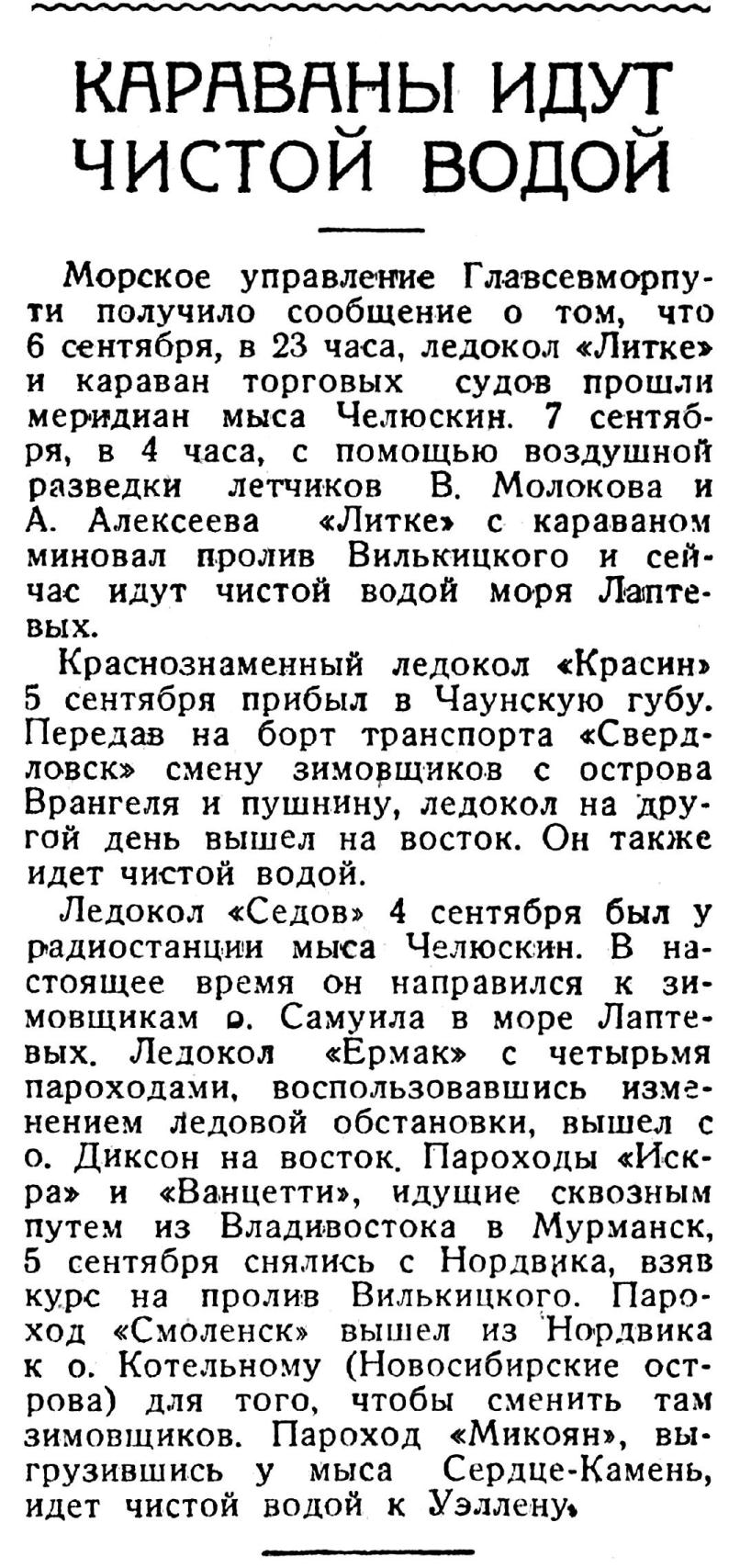 Морское управление Главсевморпу­ти получило сообщение о том, что 6 сентября, в 23 часа, ледокол "Литке" и караван торговых судов прошли меридиан мыса Челюскин. 7 сентяб­ря, в 4 часа, с помощью воздушной разведки летчиков В. Молокова и А. Алексеева "Литке" с караваном миновал пролив Вилькицкого и сей­час идут чистой водой моря Лапте­вых.
