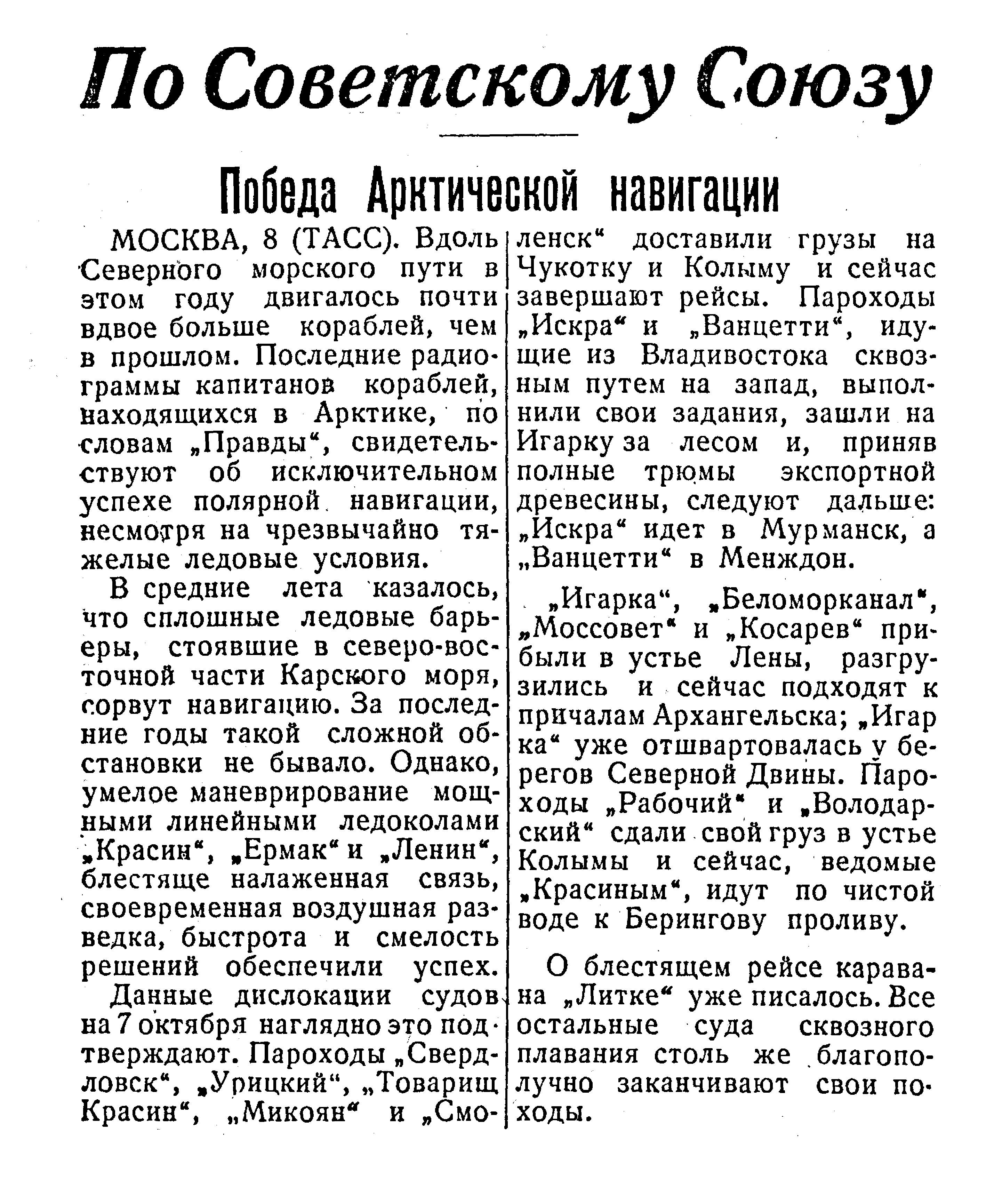 Несмотря на позднее время года, суда успешно продолжают свой путь в Арктике. Пароходы «Искра» и «Ванцетти», идущие сквозным путем из Владивостока в Архангельск, пробились в Карское море к архипелагу Норденшельда. Пароходы «Сталинград», идущий из Ленинграда во Владивосток, «Правда», «Рабочий», «Володарский», везущие грузы в устье реки Колымы, и «Беломорканал», следующий с грузом в устье Лены, прибыли в бухту Тикси. Вслед за нами идет пароход «Смоленск».