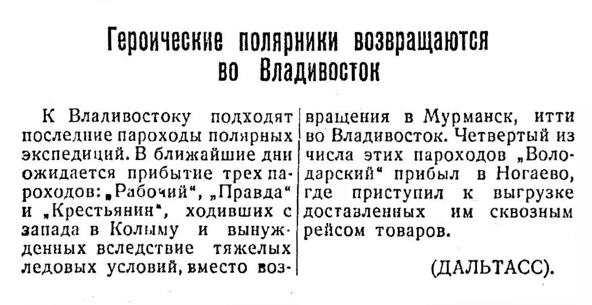 К Владивостоку подходят последние пароходы полярных экспедиций. В ближайшие дни ожидается прибытие трех пароходов: „Рабочий", „Правда" и „Крестьянин", ходивших с запада в Колыму и вынужденных вследствие тяжелых ледовых условий, вместо возвращения в Мурманск, итти во Владивосток. Четвертый из числа этих пароходов „Володарский" прибыл в Ногаево, где приступил к выгрузке доставленных им сквозным рейсом товаров.