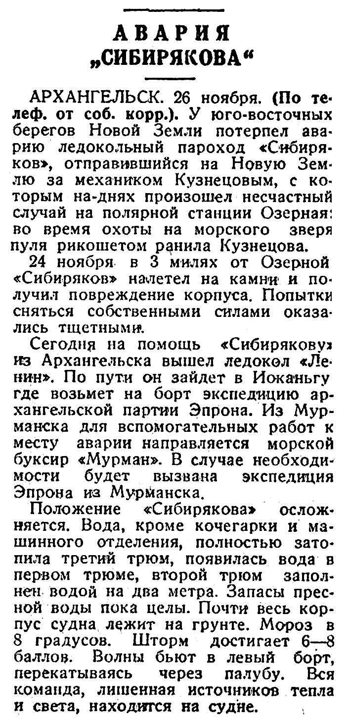 Сегодня на помощь «Сибиряковуз из Архангельска вышел ледокол «Ленин». По пути он зайдет в Иоканьгу где возьмет на борт экспедицию архангельской партии Эпрона. Из Мурманска для вспомогательных работ к месту аварии направляется морской буксир «Мурман». В случае необходимости будет вызвана экспедиция Эпрона из Мурманска.