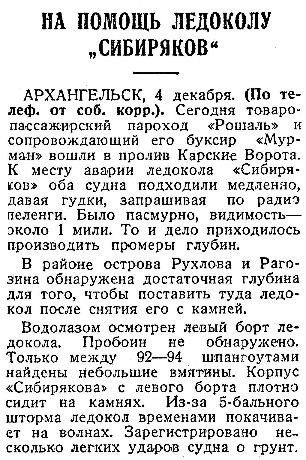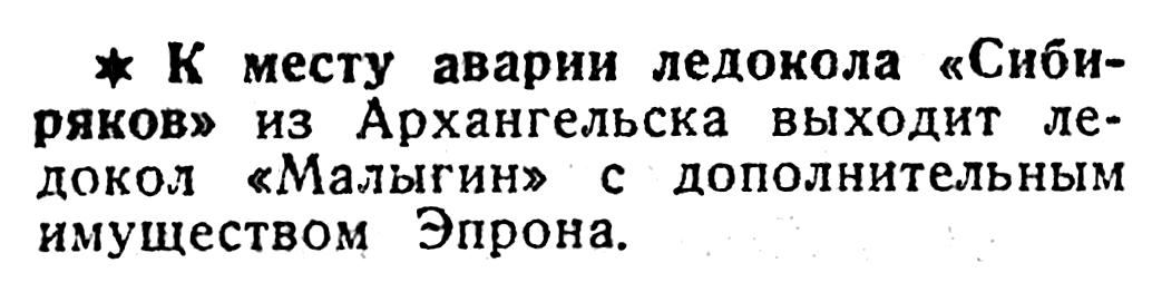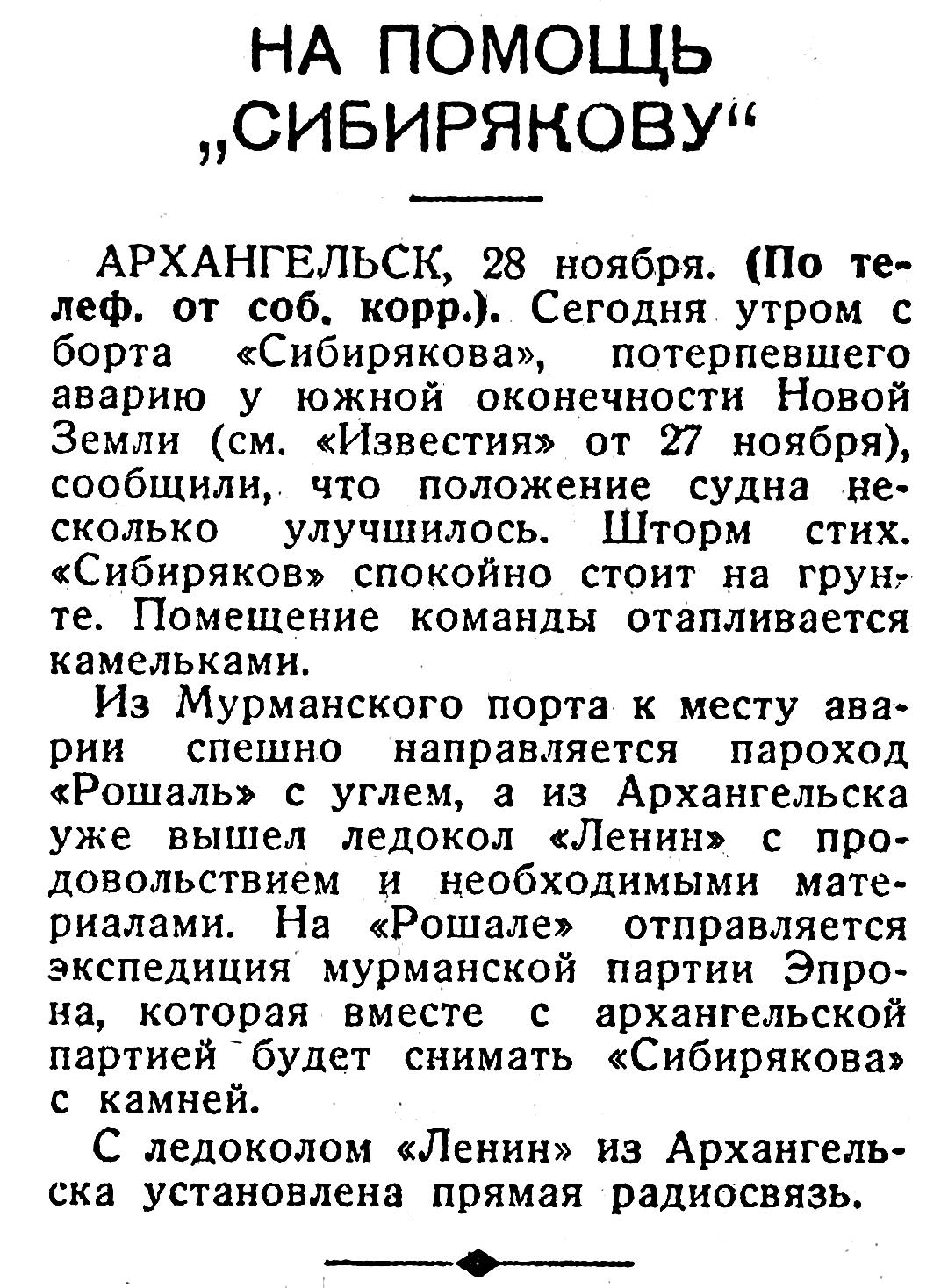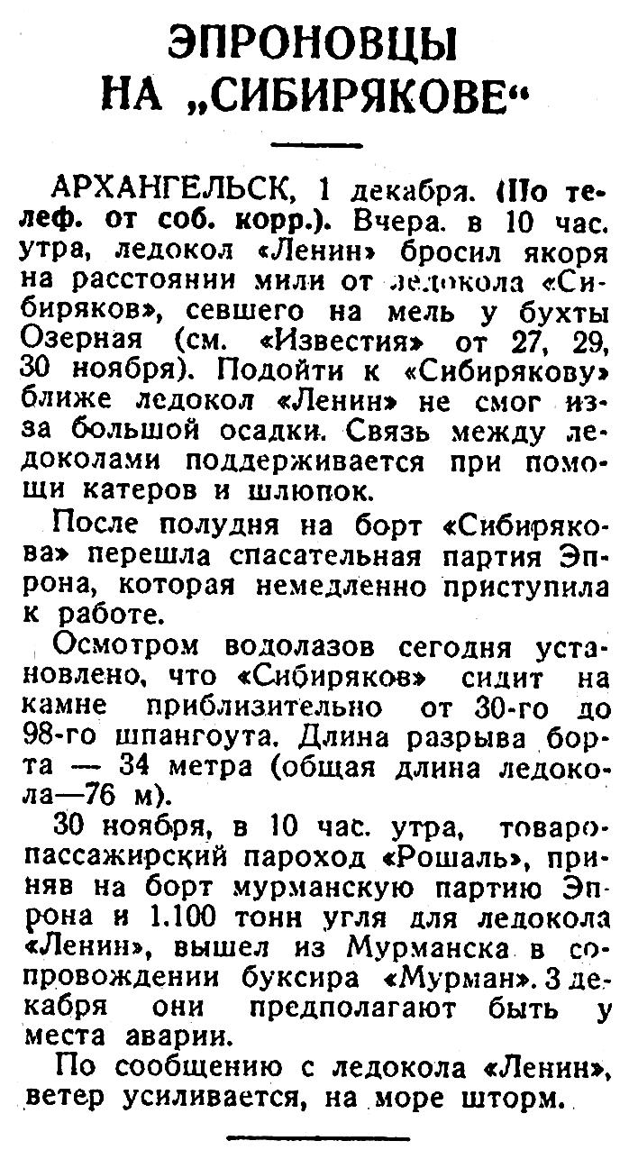 30 ноября, в 10 час. утра, товаро-пассажирский пароход «Рошаль», приняв на борт мурманскую партию Эпрона и 1.100 тонн угля для ледокола «Ленин», вышел из Мурманска в сопровождении буксира «Мурман». 3 декабря они предполагают быть у места аварии.