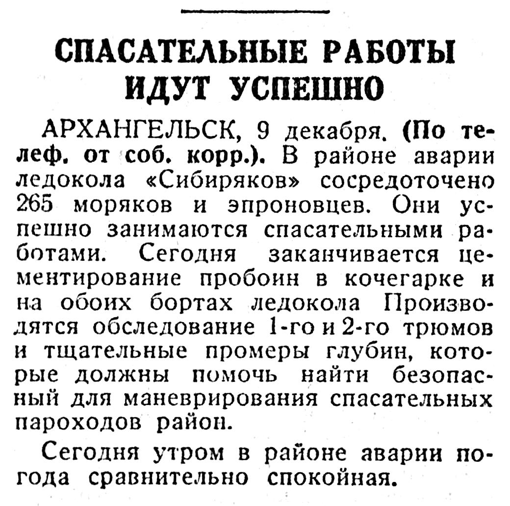 АРХАНГЕЛЬСК, 9 декабря. (По телеф. от соб. корр.). В районе аварии ледокола «Сибиряков» сосредоточено 265 моряков и эпроновцев. Они успешно занимаются спасательными работами. Сегодня заканчивается цементирование пробоин в кочегарке и на обоих бортах ледокола Производятся обследование 1-го и 2-го трюмов и тщательные промеры глубин, которые должны помочь найти безопасный для маневрирования спасательных пароходов район.