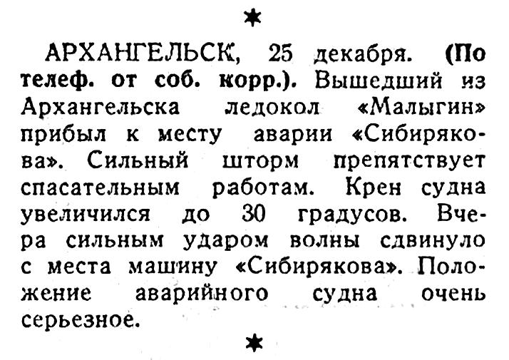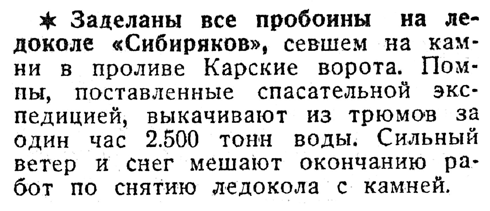 * Заделаны все пробоины на ледоколе «Сибиряков», севшем на камни в проливе Карские ворота. Помпы, поставленные спасательной экспедицией, выкачивают из трюмов за один час 2.500 тони воды. Сильный ветер и снег мешают окончанию работ по снятию ледокола с камней.