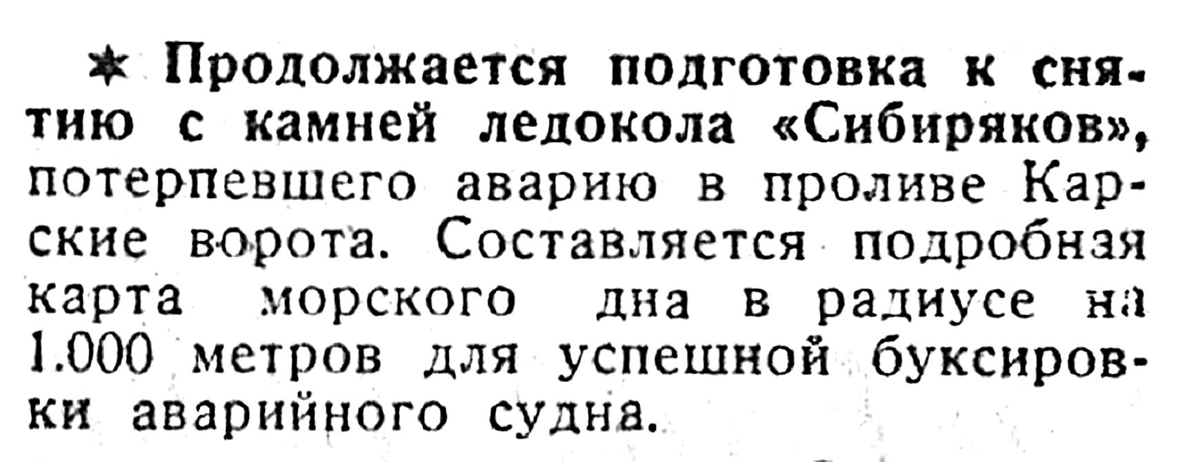 * Продолжается подготовка к снятию с камней ледокола «Сибиряков», потерпевшего аварию в проливе Карские ворота. Составляется подробная карта морского дна в радиусе на 1.000 метров для успешной буксировки аварийного судна.