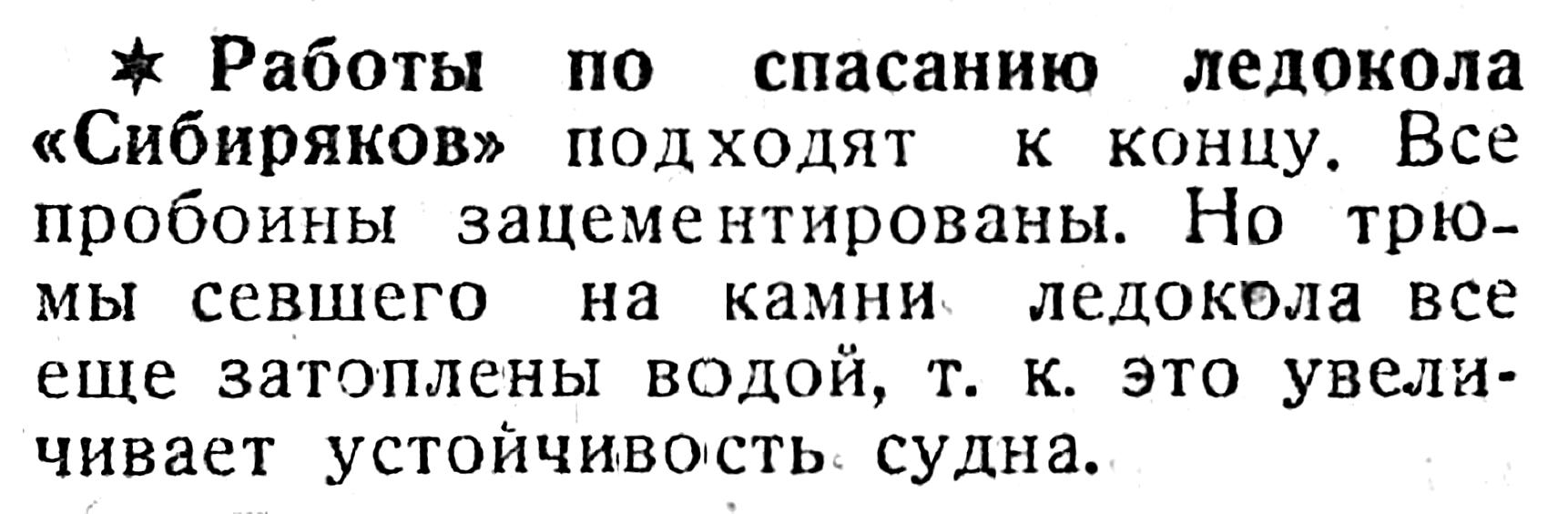 * Работы по спасанию ледокола «Сибиряков» подходят к концу. Все пробоины зацементированы. Но трюмы севшего на камни ледокола все еще затоплены водой, т. к. это увеличивает устойчивость судна.