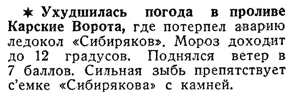 * Ухудшилась погода в проливе Карские Ворота, где потерпел аварию ледокол «Сибиряков». Мороз доходит до 12 градусов. Поднялся ветер в 7 баллов. Сильная зыбь препятствует съемке «Сибирякова» с камней.