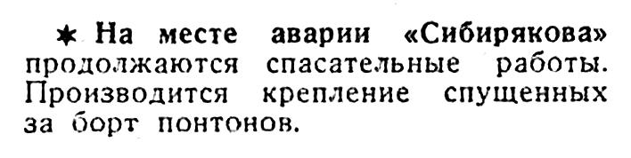 Вчера на «Сибирякове», после сорокаминутной откачки воды из 2-го трюма, уровень воды в трюме и в машинном отделении понизился на 24 сантиметра.