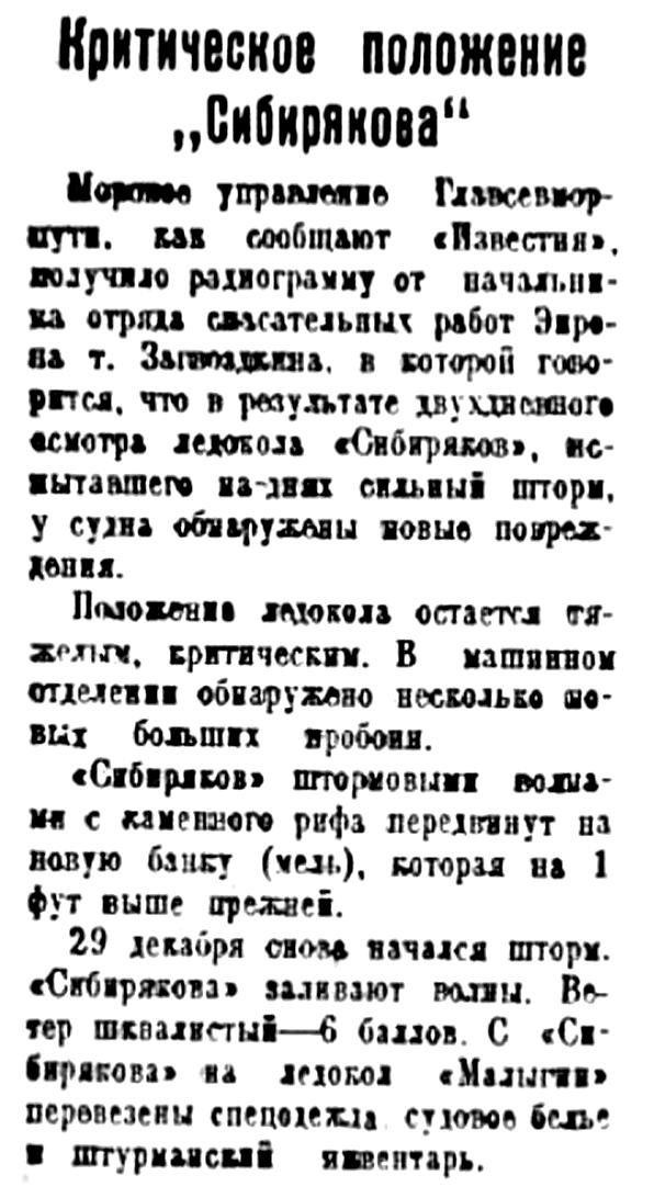 Морское управление Главсевморпути, как сообщают «Известия», получило радиограмму от начальника отряда спасательных работ Эпрона т. Загвоздкина, в которой говорится, что в результате двухдневного осмотра ледокола «Сибиряков», испытавшего на-днях сильный шторм, у судна обнаружены новые повреждения.