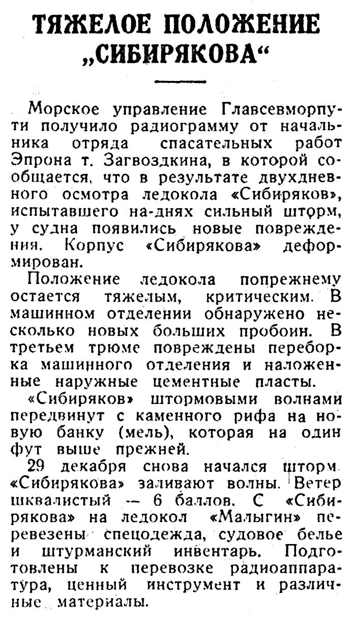 29 декабря снова начался шторм. «Сибирякова» заливают волны. Ветер шквалистый — 6 баллов. С «Сибирякова» на ледокол «Малыгин» перевезены спецодежда, судовое белье и штурманский инвентарь.