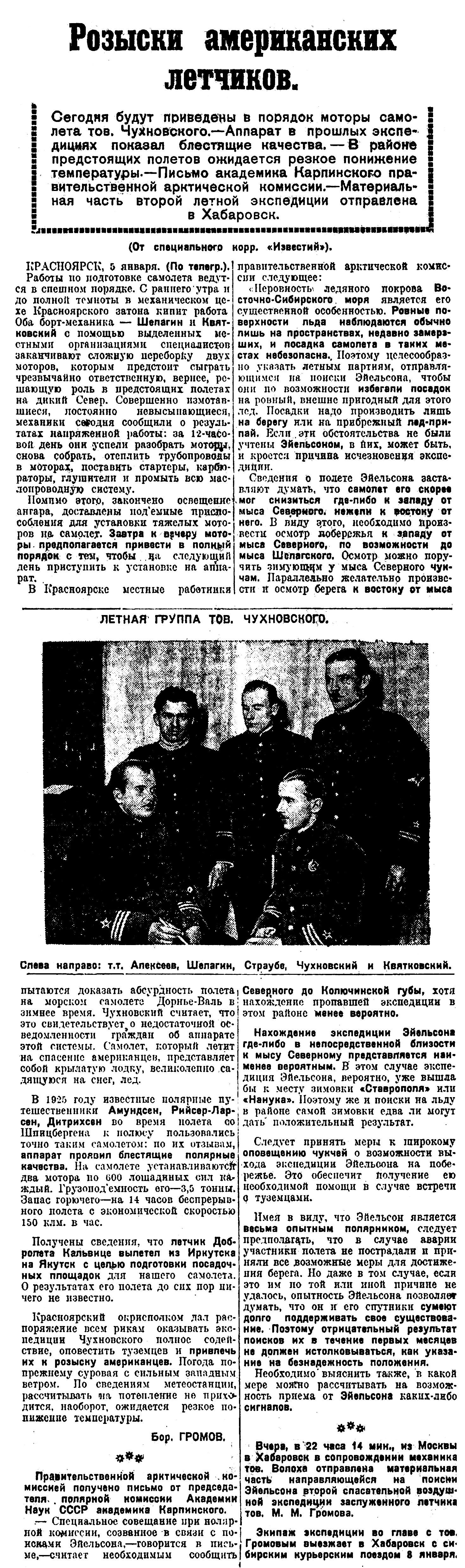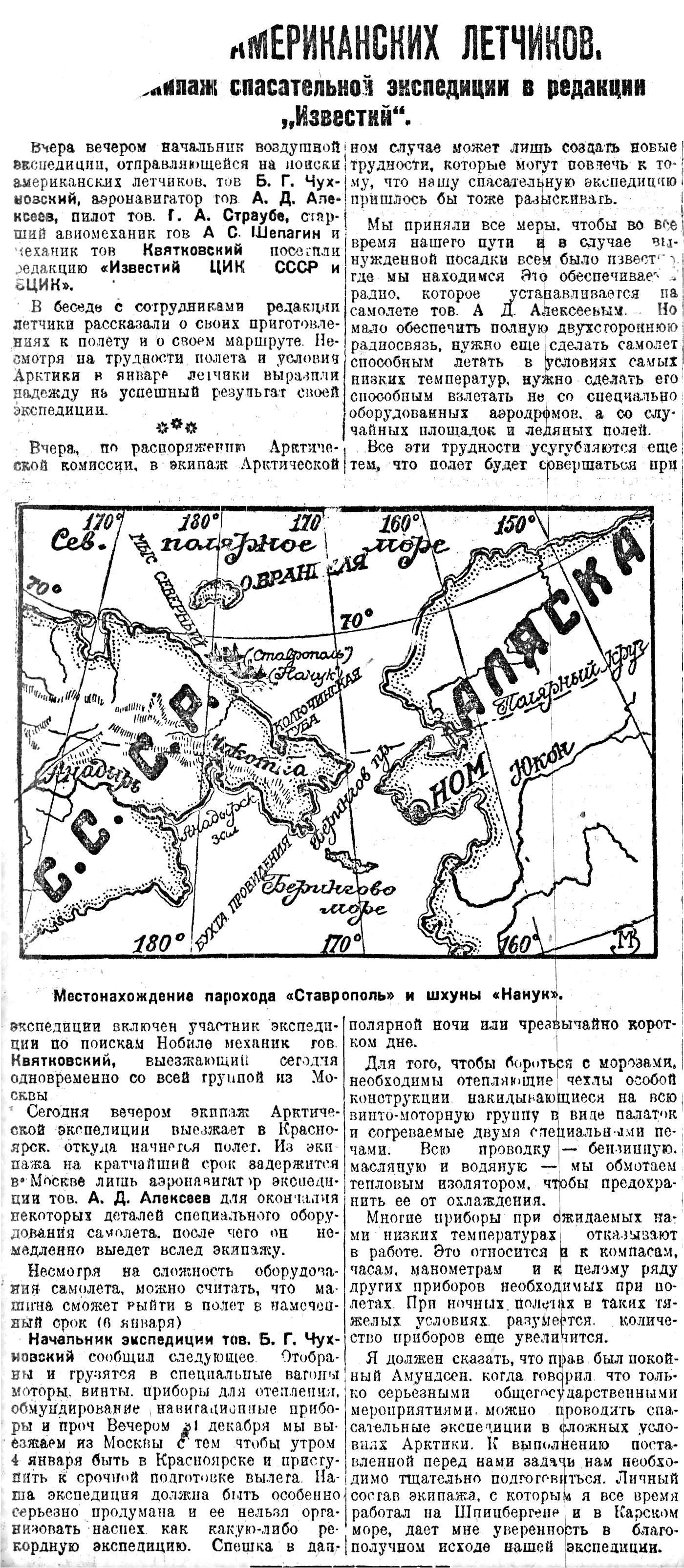 Вчера вечером начальник воздушной экспедиции, отправляющейся на поиски американских летчиков, тов Б. Г. Чухновский, аэронавигатор тов. А. Д. Алексеев, пилот тов. Г. А. Страубе, старший авиомеханик тов. А. С. Шелагин и механик тов. Квятковский посетили редакцию "Известий ЦИК СССР и ВЦИК".
