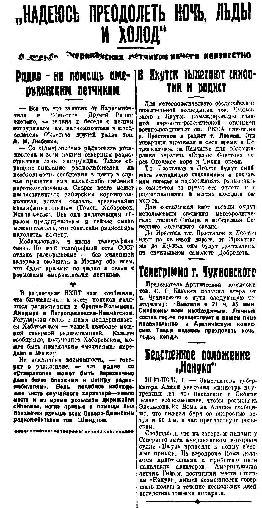 Готовится к полетам второй мощный самолет. ♦ Советская колония на о. Врангеля принимает активное участке в розысках. ♦ Со "Ставрополем" восстановлена радиосвязь. ♦ Добролет организует ряд бензиновых и технический баз. ♦ Тт. Чухновский, Страубе, Алексеев и Шелагин завтра выезжают в Красноярск.