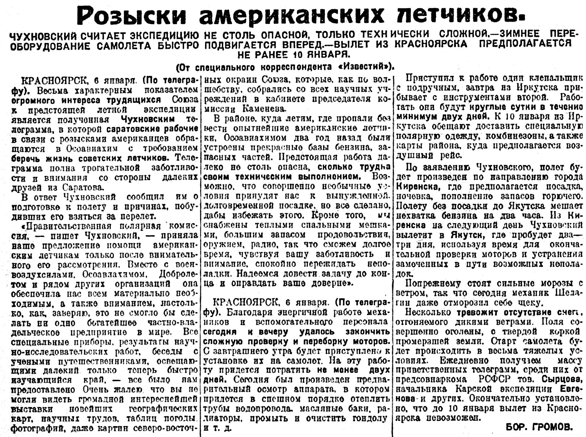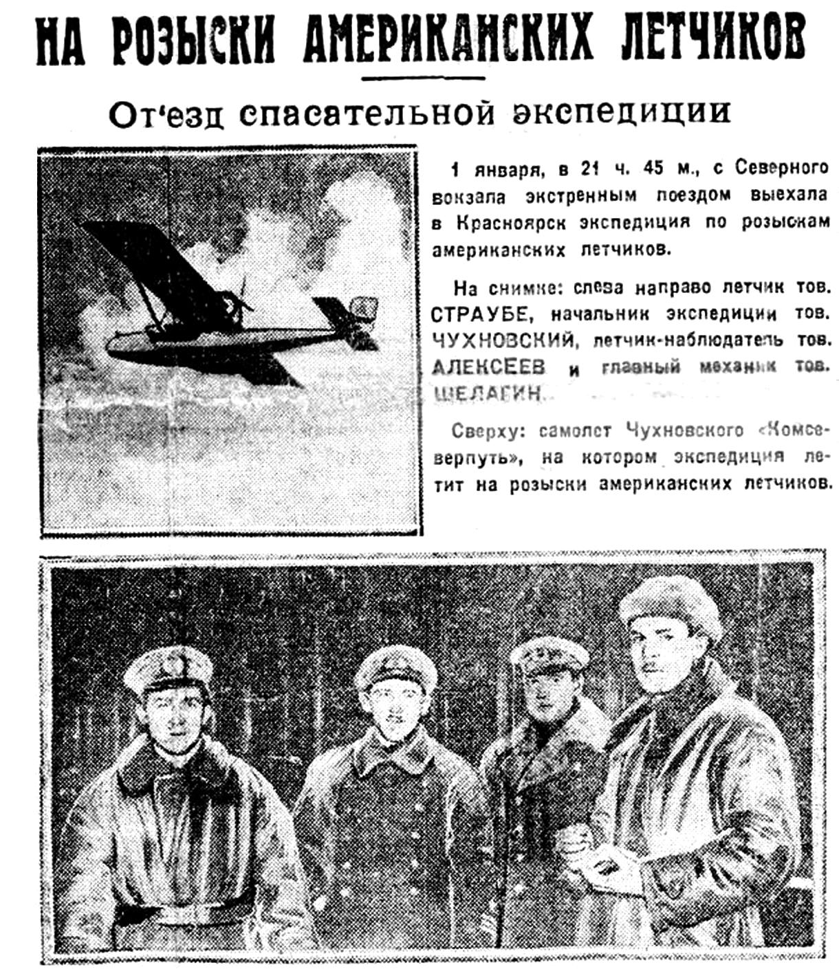 Командир самолета, отправляющегося на поиски американских летчиков, тов. Чухновский и летчик-наблюдатель тов. Алексеев находятся в Москве. Летчик тов. Страубе и борт-механик т. Шелагин срочно вызваны из Ленинграда, Выезд экипажа из Москвы в Красноярск назначен на завтра, 31 декабря, в 22 часа.