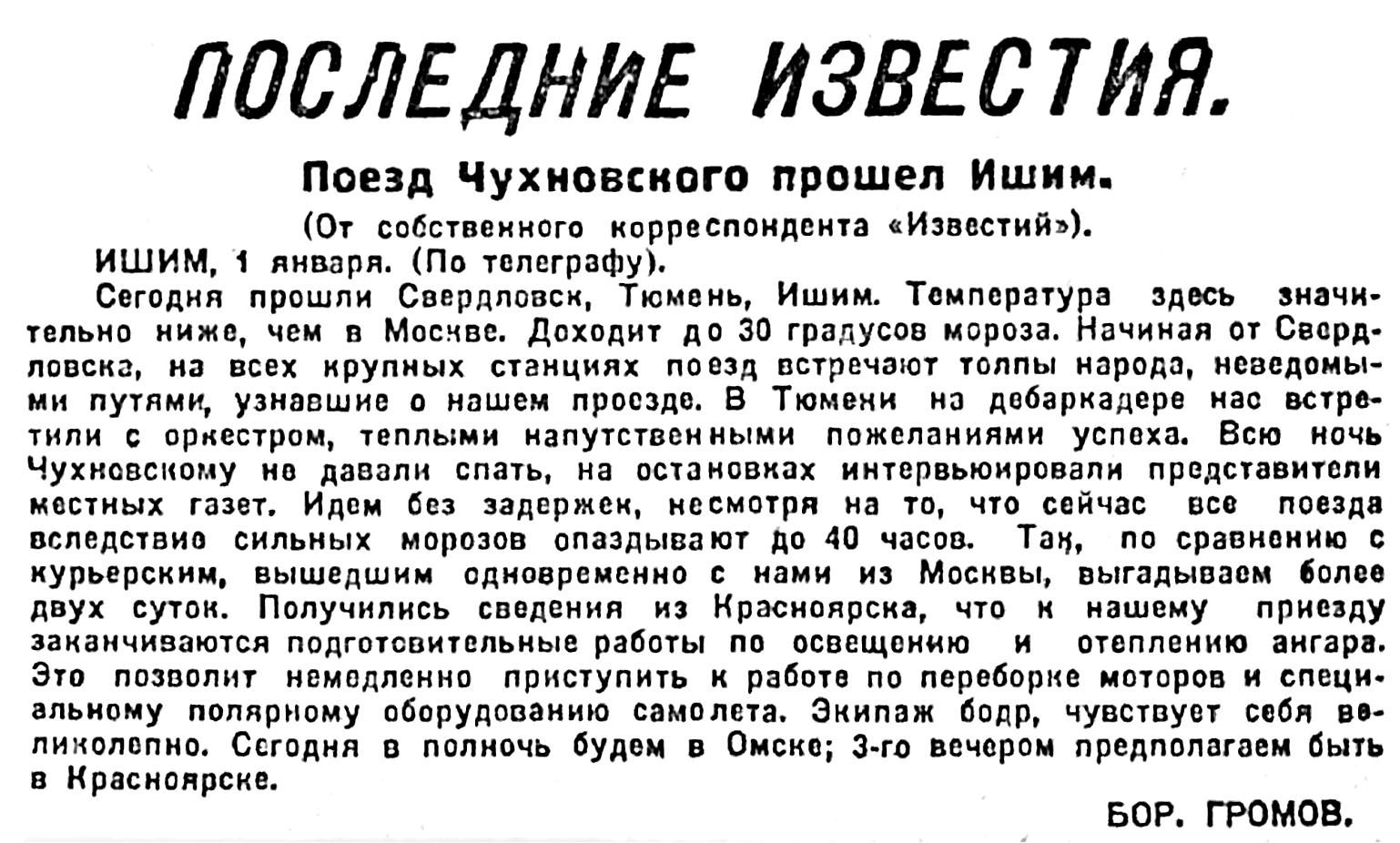Экипаж экспедиции во главе с тов. Громовым выезжает в Хабаровск с сибирским курьерским поездом 8 января.
