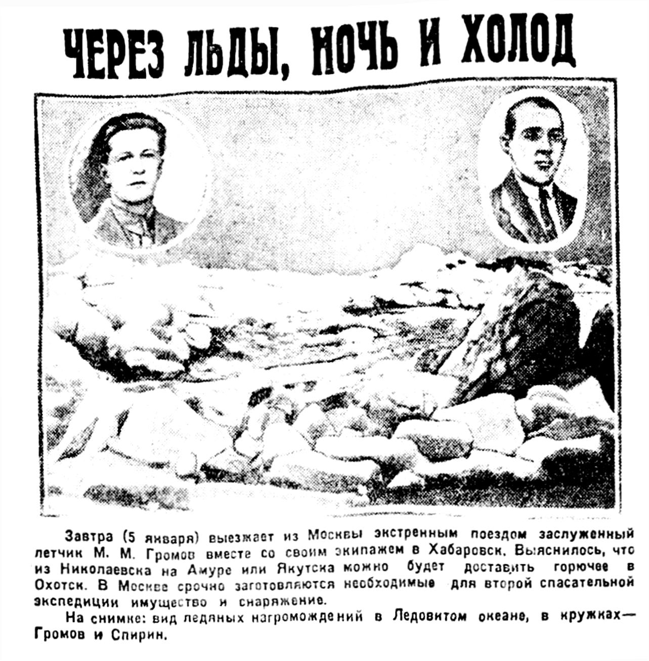 Вчера, в 5 часов вечера, из Москвы с сибирским экспрессом выехали в Хабаровск на поиски американских летчиков заслуженный летчик тов. М. М. Громов и аэронавигатор тов. Спирин.