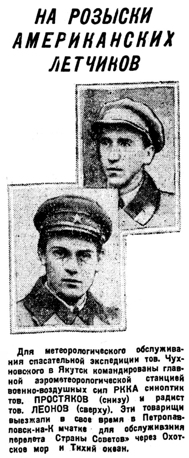 Командир самолета, отправляющегося на поиски американских летчиков, тов. Чухновский, и летчик-наблюлатель тов. Алексеев находятся в Москве. Летчик тов. Страубе и борт-механик тов. Шелагин срочно вызваны из Ленинграда.