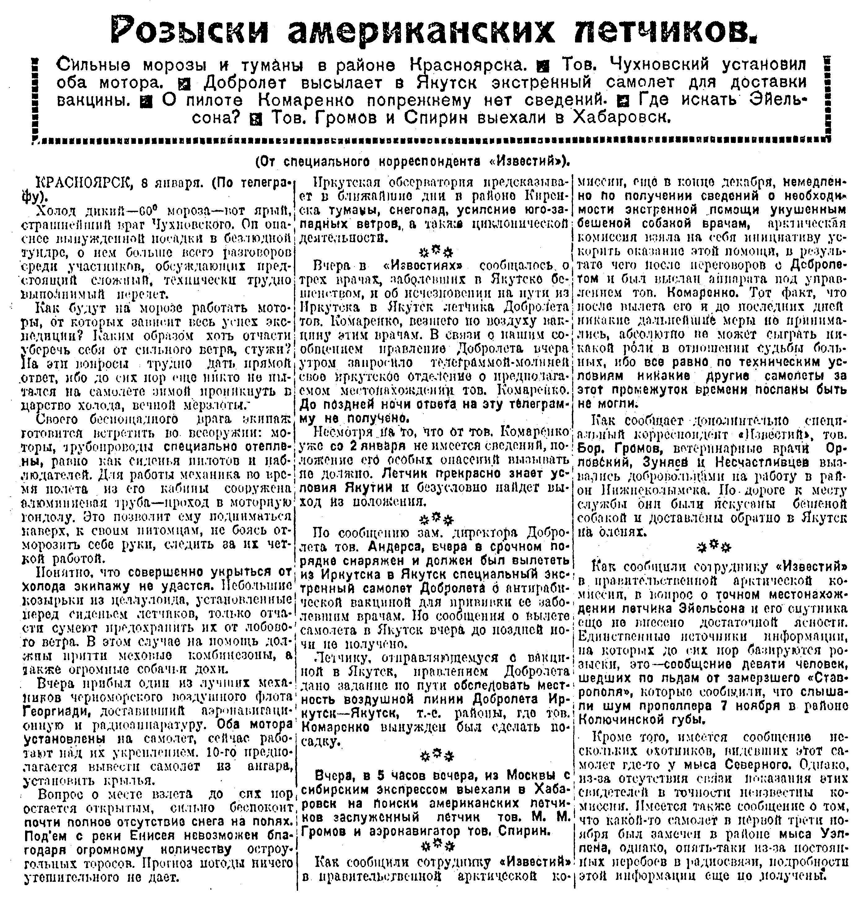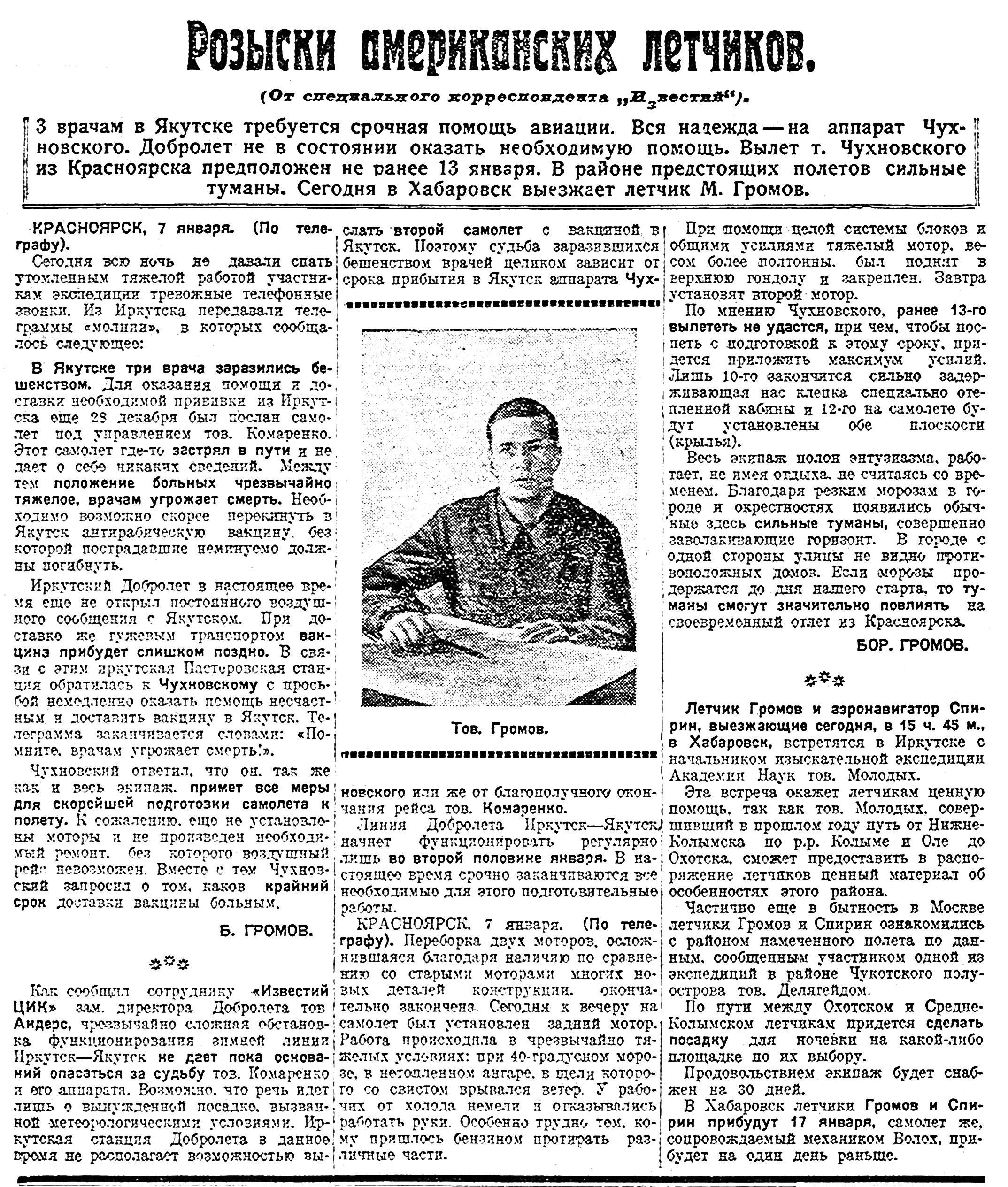 3 врачам в Якутске требуется срочная помощь авиации. Вся надежда — на аппарат Чухновского. Добролет не в состоянии оказать необходимую помощь. Вылет т. Чухновского из Красноярска предположен не ранее 13 января. В районе предстоящих полетов сильные туманы. Сегодня в Хабаровск выезжает летчик М. Громов.