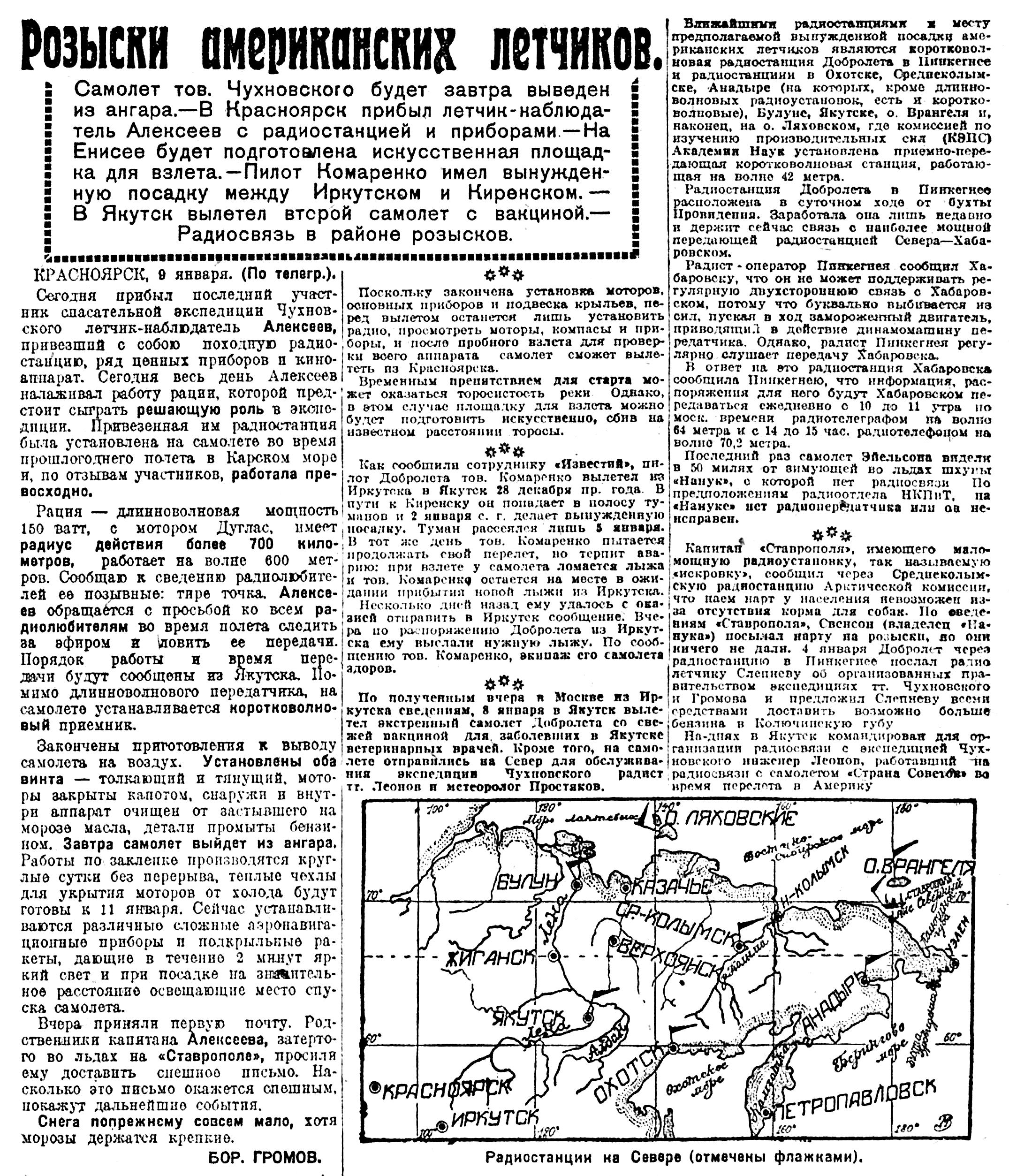 Капитан "Ставрополя", имеющего маломощную радиоустановку, так называемую "искровку", сообщил через Среднеколымскую радиостанцию Арктической комиссии, что наем нарт у населения невозможен из-за отсутствия корма для собак. По сведениям "Ставрополя", Свенсон (владелец "Нанука") посылал нарту на розыски, но они ничего не дали. 4 января Добролет через радиостанцию в Пинкегнее послал радио летчику Слепневу об организованных правительством экспедициях тт. Чухновского и Громова и предложил Слепневу всеми средствами доставить возможно больше бензина в Колючинскую губу
