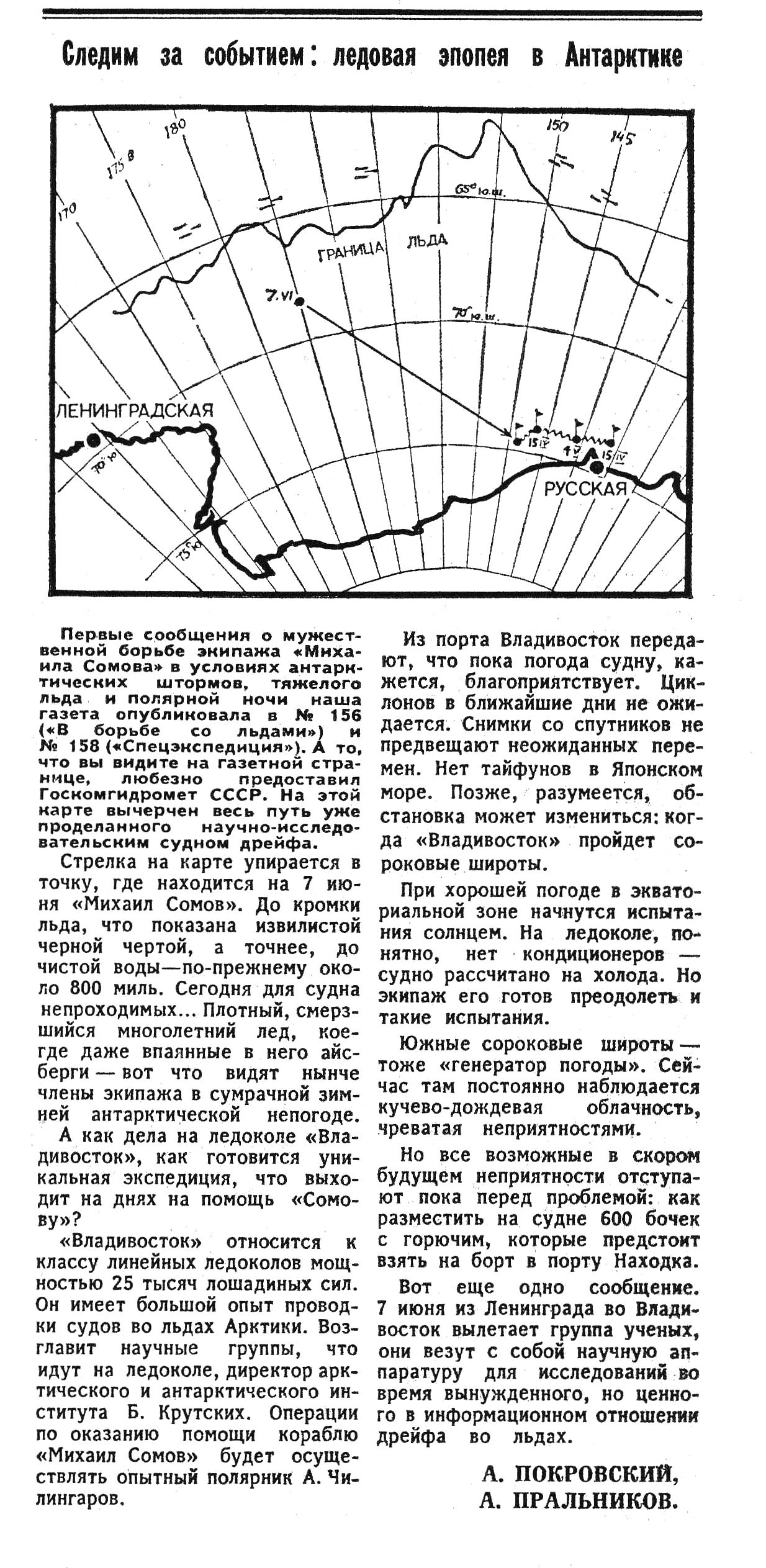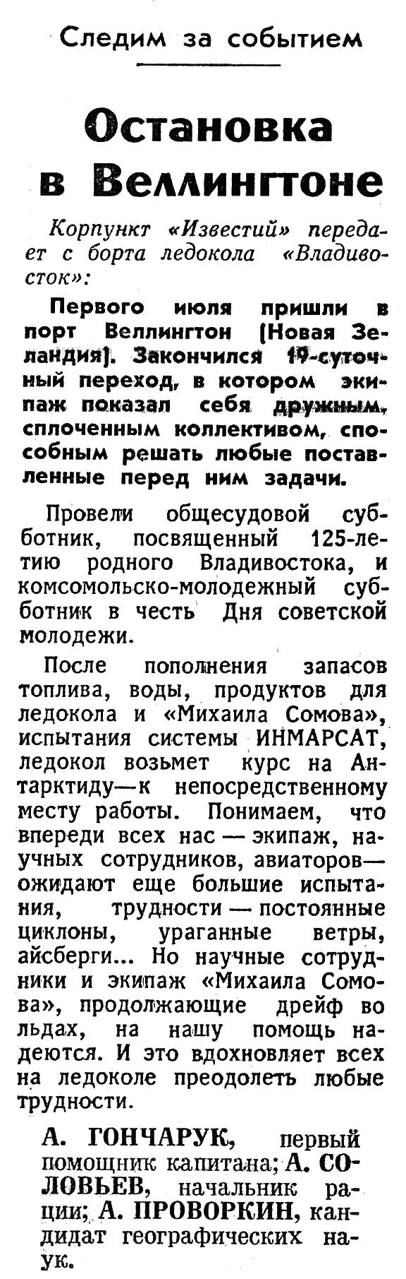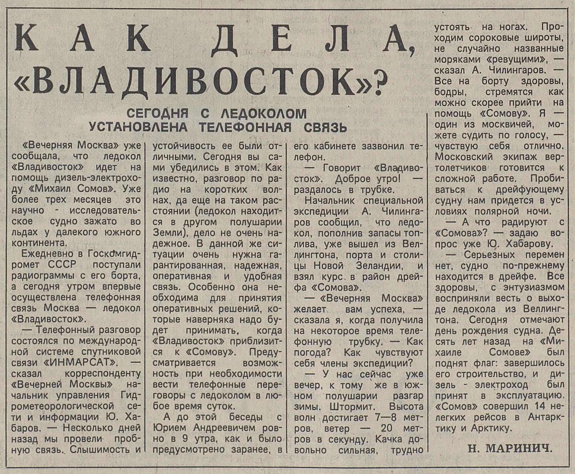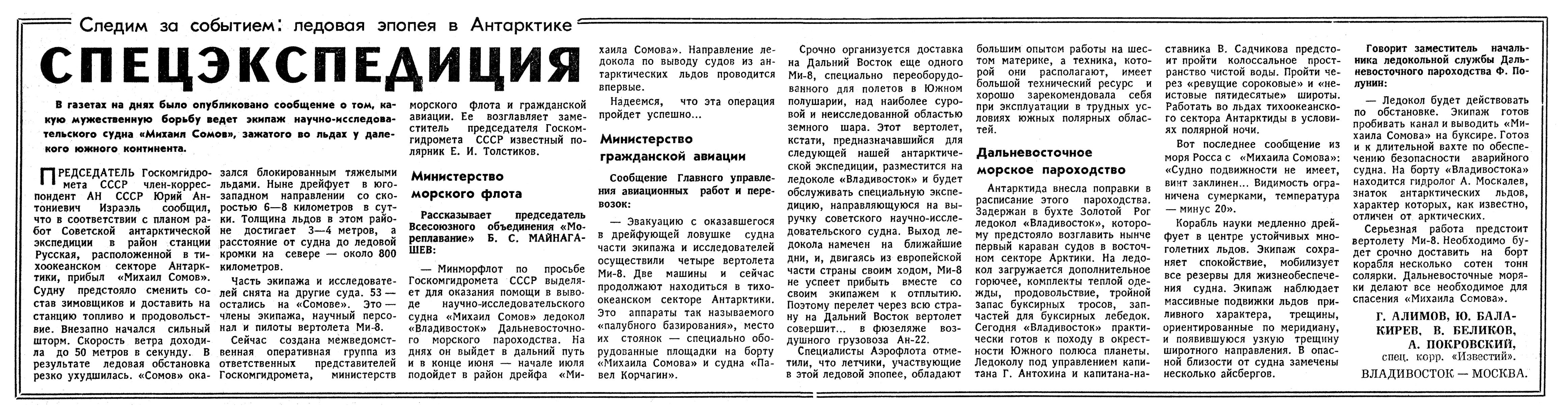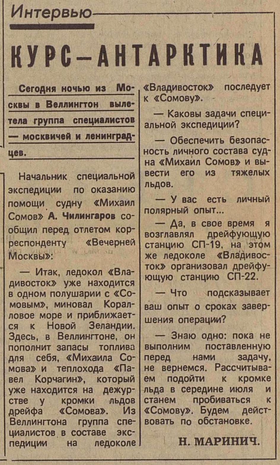 — Какие задачи стоят перед специальной экспедицией?— В первую очередь обеспечить безопасность личного состава судна «Михаил Сомов» и вывести его из тяжелых льдов. Задача сложная: опыта плавания ледокола в южных широтах нет, не так просто будет перейти экваториальную зону, «ревущие» сороковые... Ледоколу «Владивосток», который уже вышел в путь, придется действовать в условиях антарктической ночи. Все это потребует от экипажа максимума профессиональных знаний, сплоченности, выдержки и мужества.