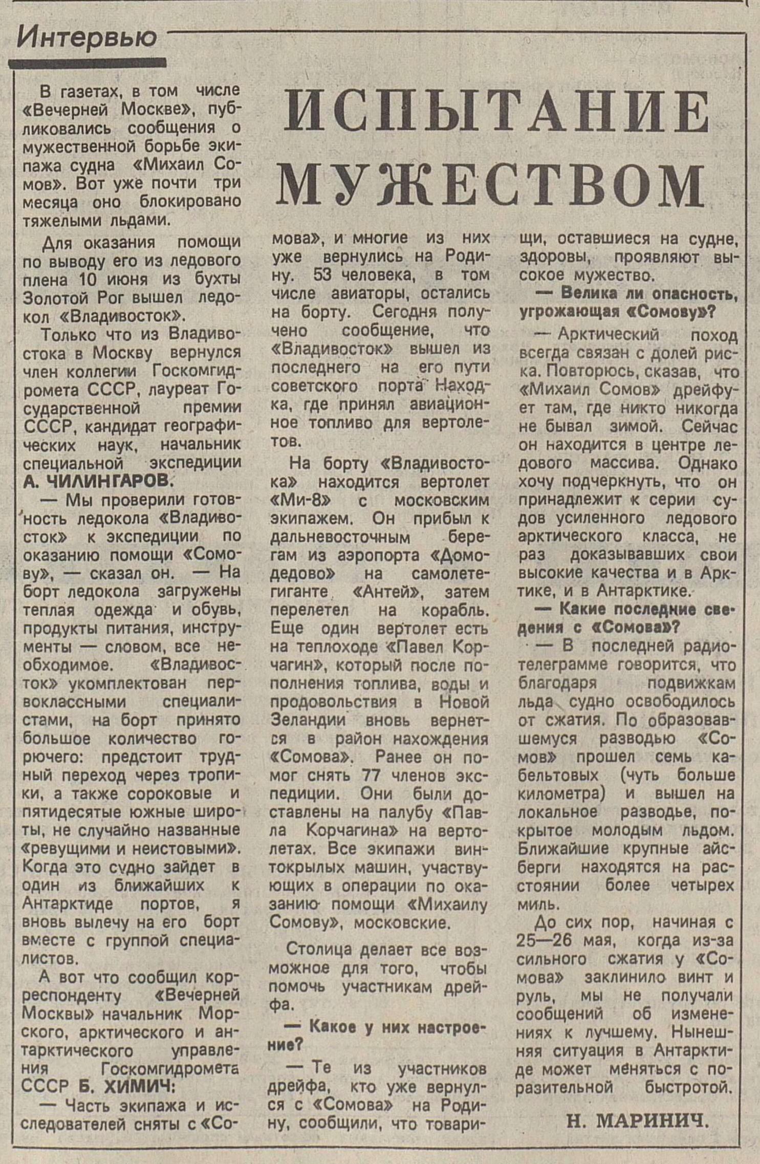 НАЧАЛЬНИК СПЕЦЭКСПЕДИЦИИНачальником Специальной экспедиции по оказанию помощи судну «Михаил Сомов» Совет Министров СССР назначил А. Н. ЧИЛИНГАРОВА.Чилингаров Артур Николаевич, известный полярник, родился в Ленинграде, ему 45 лет, закончил арктический факультет Высшего инженерного морского училища имени адмирала Макарова. Возглавлял дрейфующую станцию СП-19, на ледоколе «Владивосток» организовывал дрейфующую станцию СП-22, в Антарктиде был начальником станции Беллинсгаузена. Член коллегии Госкомгидромета СССР. Кандидат географических наук, лауреат Государственной премии СССР.— Нет-нет, да услышишь реплики: мол, «Сомов» по своей вине угодил в ледовую ловушку. Что можете сказать по этому поводу?— Досужие разговоры — не больше. Походы на шестой континент всегда сопряжены с трудностями, сложностями, если хотите, с риском. Экипаж «Михаила Сомова», отправляясь к станции Русской, естественно, рассчитывал не на легкую прогулку, он знал, что места, где находится эта станция, едва ли не самые коварные в Антарктиде.