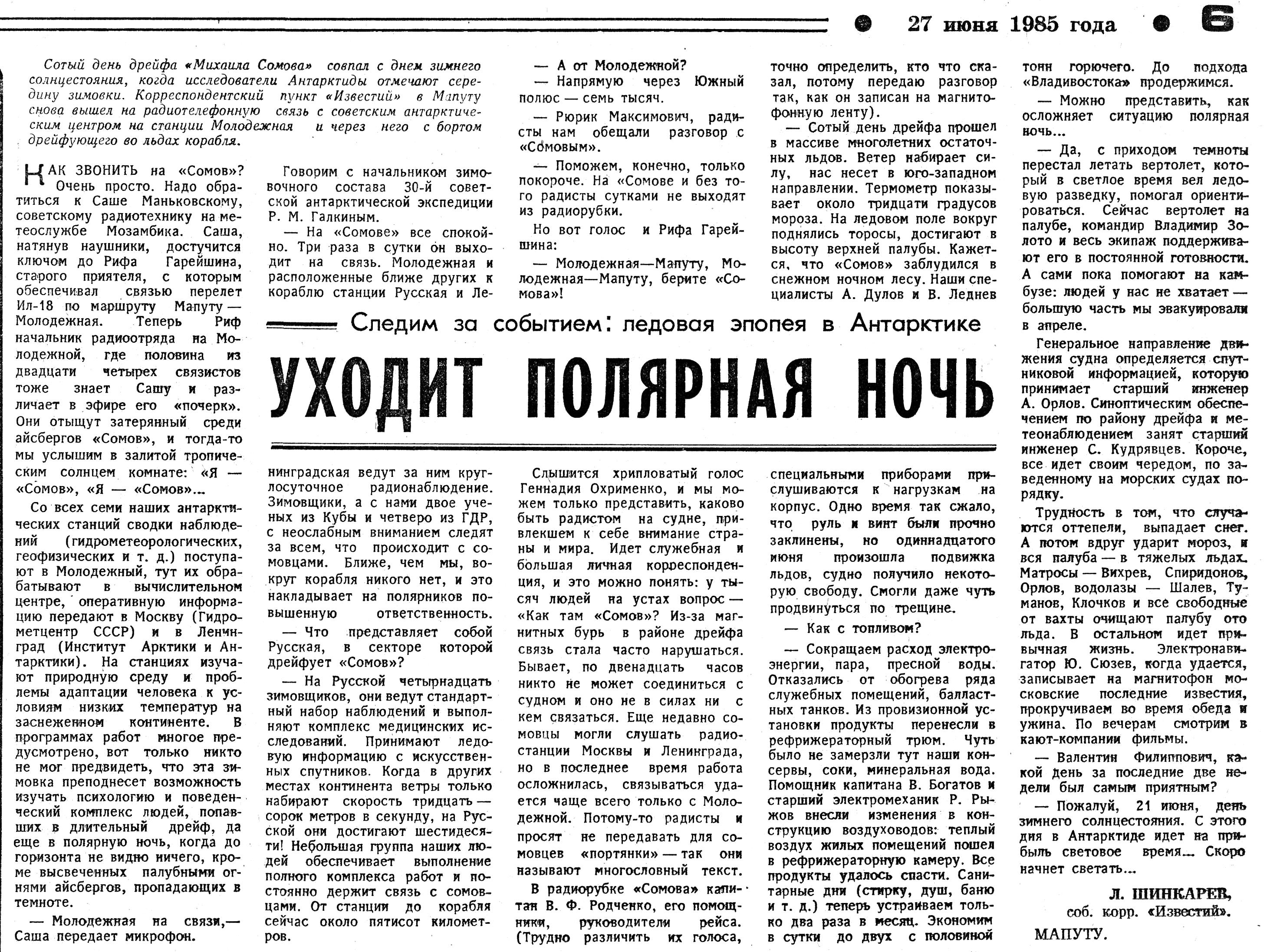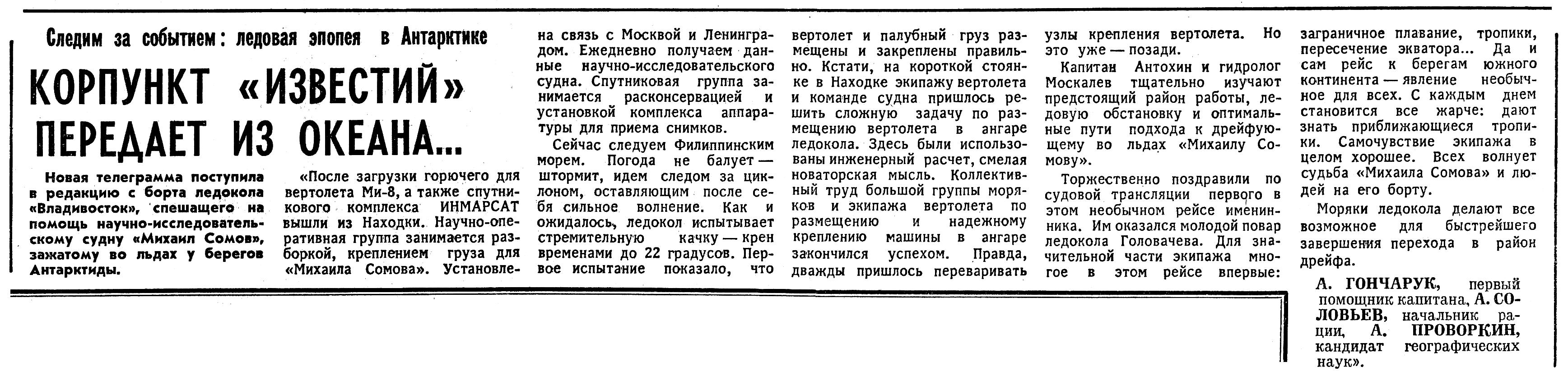 Самая большая нагрузка падает, пожалуй, на начальника радиостанции Г. Охрименко и электронавигатора Ю. Сиузева. «Михаил Сомов» поддерживает связь со всеми советскими антарктическими станциями и с находящимися в экспедиции кораблями, передает сообщения в Москву, Ленинград, Киев, Архангельск, Мурманск, Владивосток...