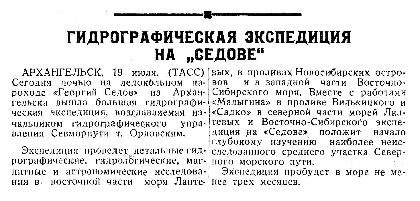 АРХАНГЕЛЬСК, 19 июля. (ТАСС). Сегодня ночью на ледокольном пароходе «Георгий Седов» из Архангельска вышла большая гидрографическая экспедиция, возглавляемая начальником гидрографического управления Севморпути т. Орловским.