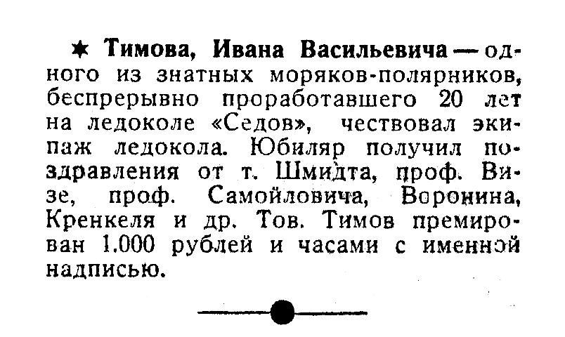Тимова, Ивана Васильевича — одного из знатных моряков-полярников, беспрерывно проработавшего 20 лет на ледоколе «Седов», чествовал экипаж ледокола. Юбиляр получил поздравления от т. Шмидта, проф. Визе, проф. Самойловича, Воронина, Кренкеля и др. Тов. Тимов премирован 1.000 рублей и часами с именной надписью.