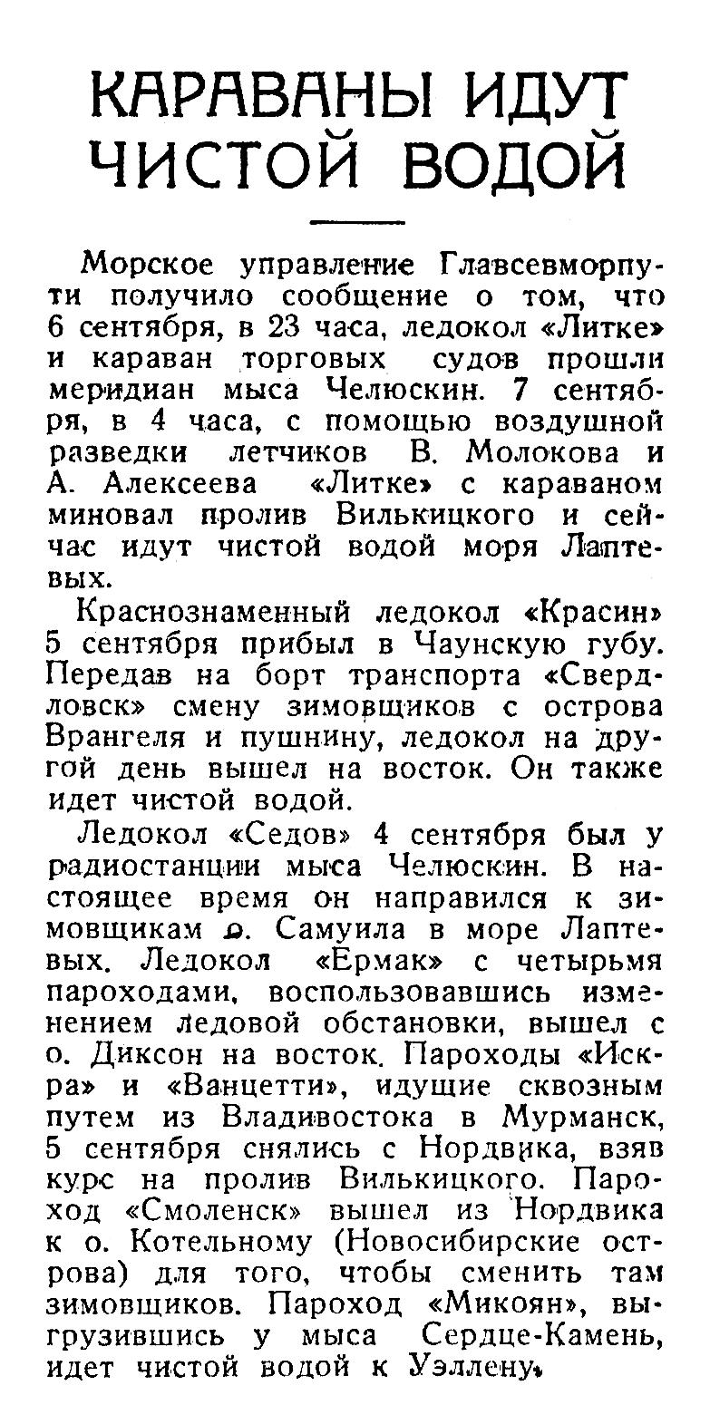 АРХАНГЕЛЬСК, 3 сентября. (ТАСС). Разведками ледоколов «Седов» и «Литке» и самолета т. Алексеева установлено, что от мыса Стерлегова до мыса Челюскина вдоль берега образовалась полоса чистой воды шириной от 5 до 10 миль. Дойдя до этой полосы, караван судов вчера полным ходом двинулся к проливу Вилькицкого. Завтра его выйдут догонять ледокол «Ермак» и пароход «Диксон», находящиеся на о. Диксон.
