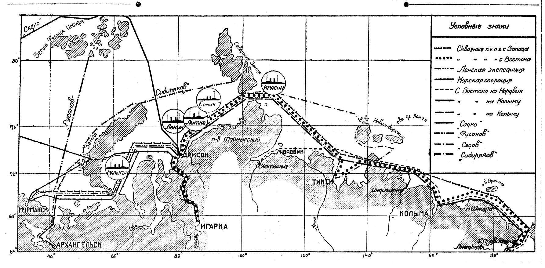 Ниже помещена карта полярных экспедиций Главсевморпути в навигацию этого года. Кружками обозначены ледоколы, проводящие караваны судов по указанным на схеме маршрутам.