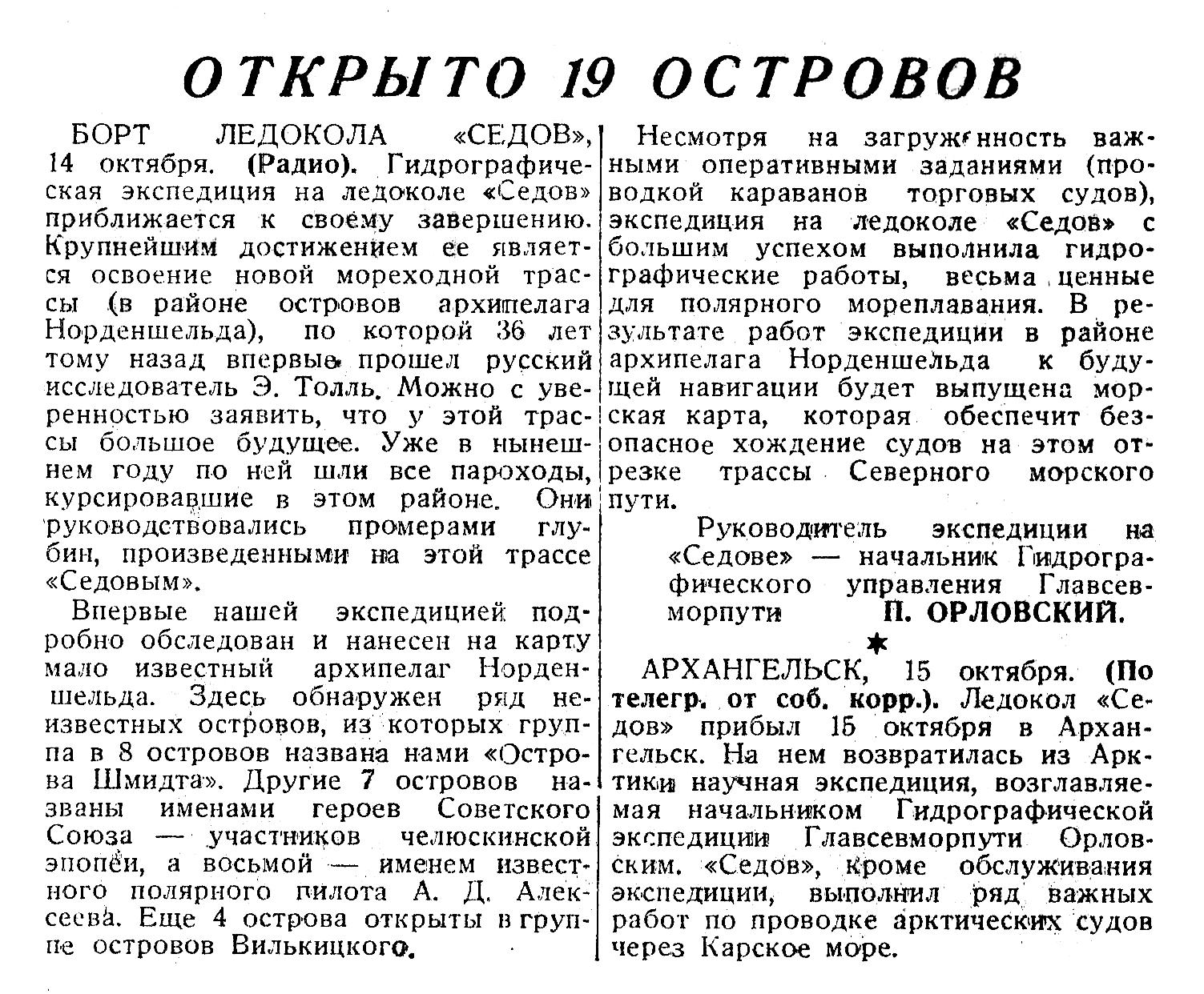 Впервые нашей экспедицией подробно обследован и нанесен на карту мало известный архипелаг Норденшельда. Здесь обнаружен ряд неизвестных островов, из которых группа в 8 островов названа нами «Острова Шмидта». Другие 7 островов названы именами героев Советского Союза — участников челюскинской эпопеи, а восьмой — именем известного полярного пилота А. Д. Алексеева. Еще 4 острова открыты в группе островов Вилькицкого.