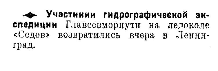 Участники гидрографической экспедиции Главсевморпути на ледоколе «Седов» возвратились вчера в Ленинград.