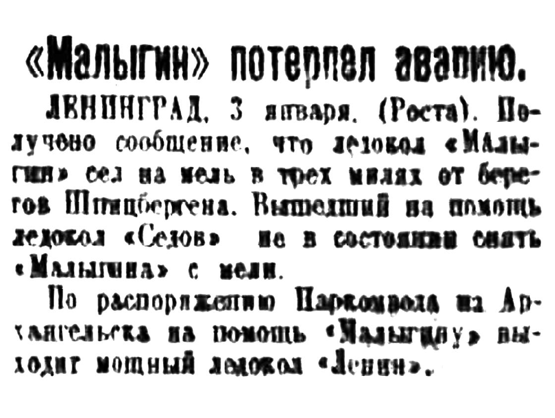 ЛЕНИНГРАД, 3 января. (Роста). Получено сообщение, что ледокол «Малыгин» сел на мель в трех милях от берегов Шпицбергена. Вышедший на помощь ледокол «Седов» не в состоянии снять «Малыгина» с мели.