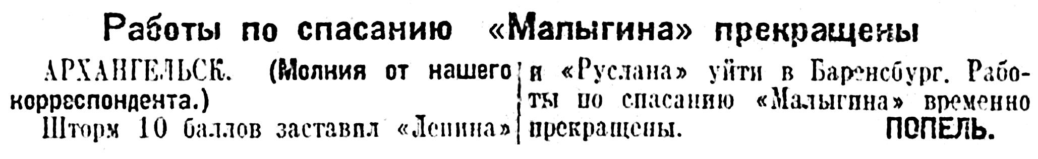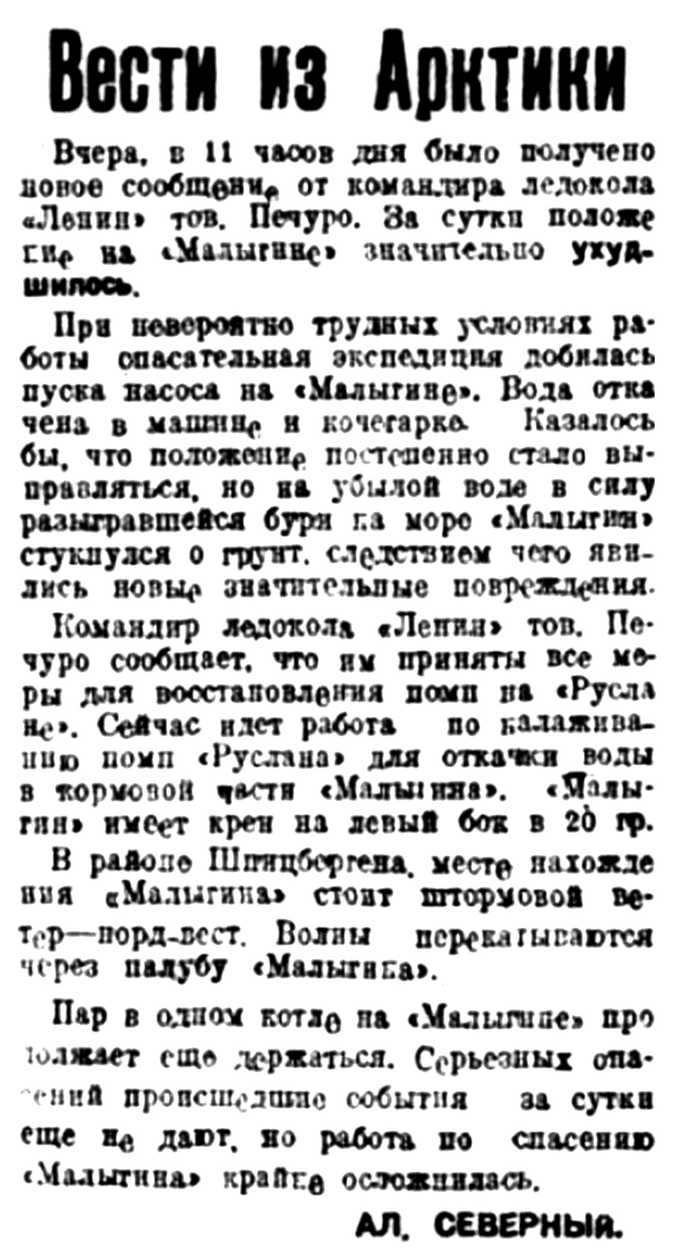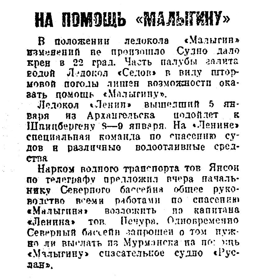 Нарком водного транспорта тов Янсон по телеграфу предложил вчера начальнику Северного бассейна общее руководство всеми работами по спасению «Малыгина» возложить на капитана «Ленина» тов. Печура. Одновременно Северный бассейн запрошен о том нужно ли выслать из Мурманска на помощь «Малыгину» спасательное судно «Руслан».