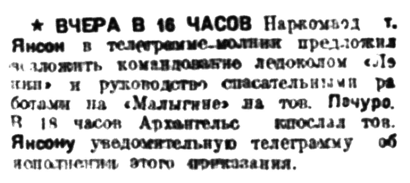 ВЧЕРА В 16 ЧАСОВ Наркомвод т. Янсон в телеграмме-молнии предложил возложить командование ледоколом «Ленин» и руководство спасательными работами на «Малыгине» на тов. Печуро. В 18 часов Архангельск послал тов. Янсону уведомительную телеграмму об исполнении этого приказания.