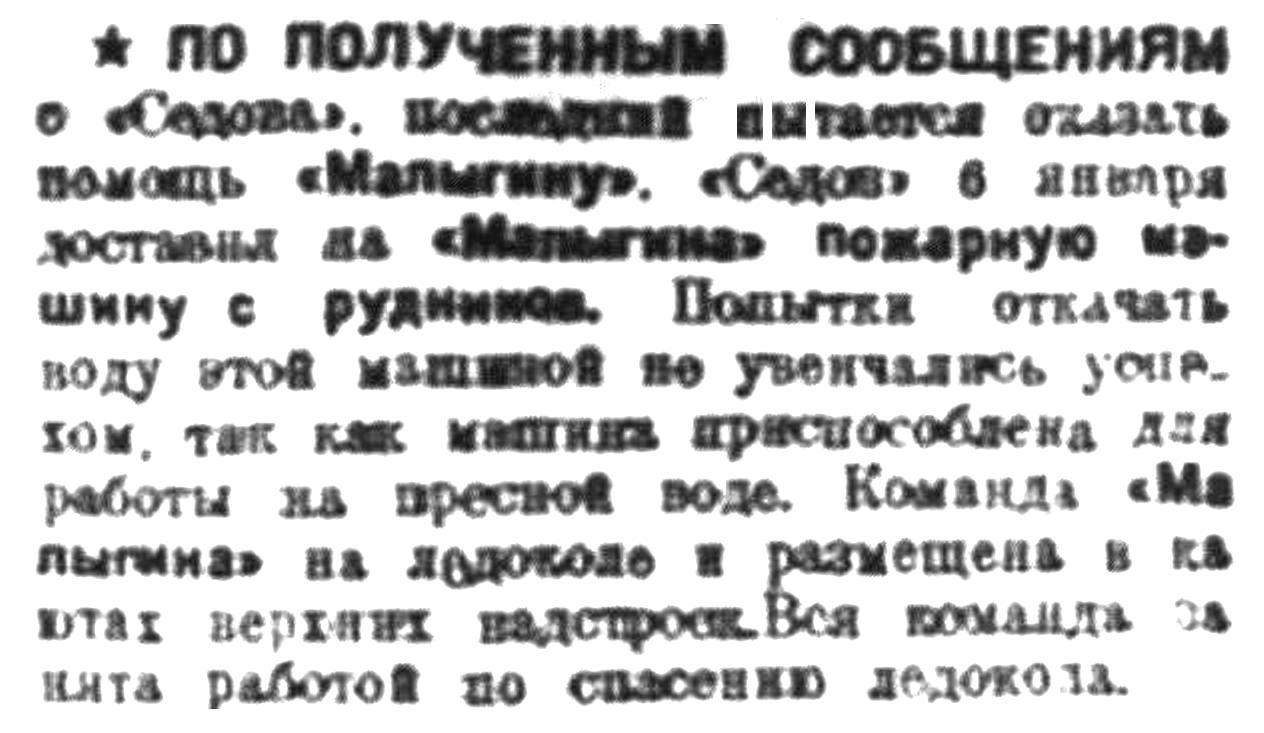 ПО ПОЛУЧЕННЫМ СООБЩЕНИЯМ с «Седова», последний пытается оказать помощь «Малыгину». «Седов» 6 января доставил на «Малыгина» пожарную машину с рудников. Попытки откачать воду этой машиной не увенчались успехом. так как машина приспособлена для работы на пресной воде. Команда «Малыгина» на ледоколе и размещена в каютах верхних надстроек. Вся команда занята работой по спасению ледокола.