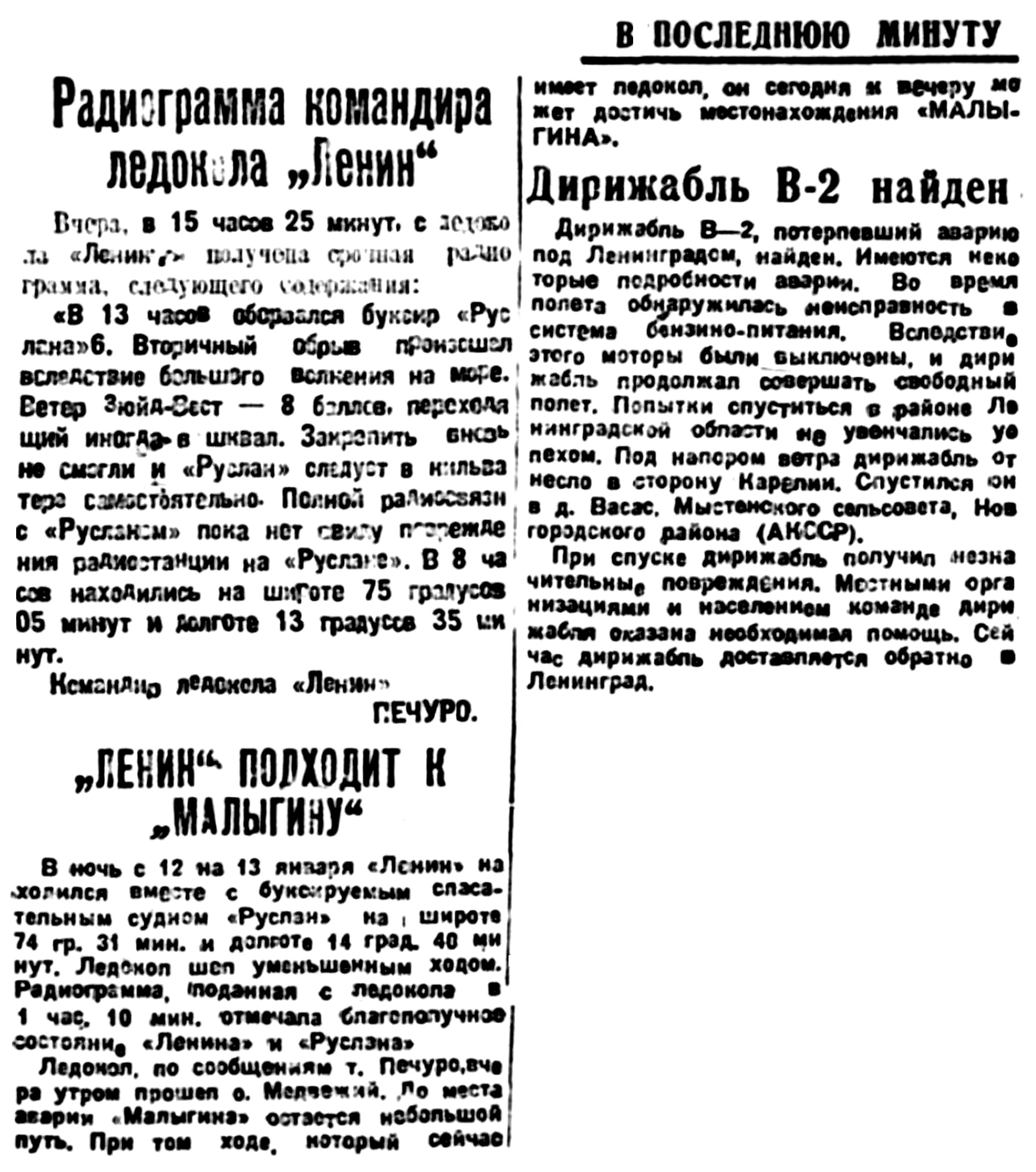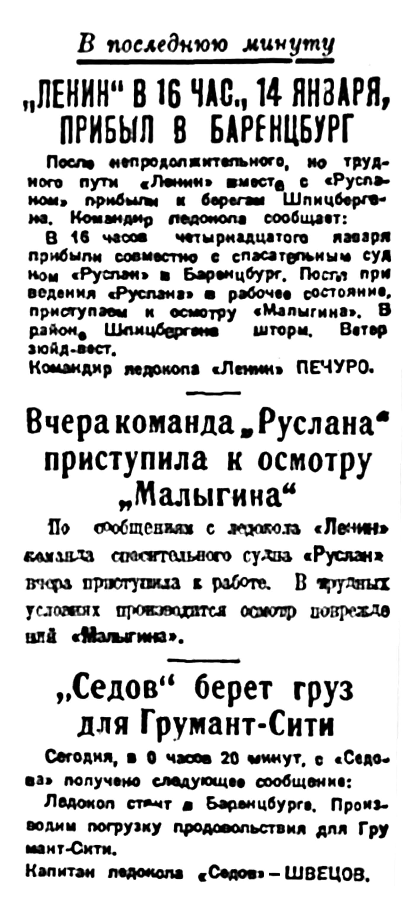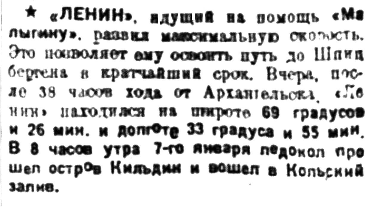В ночь с 12 на 13 января «Ленин» находился вместе с буксируемым спасательным судном «Руслан» на широте 74 гр. 31 мин. и долгота 14 град. 40 минут. Ледокол шел уменьшенным ходом. Радиограмма, поданная с ледокола в 1 час. 10 мин. отмечала благополучное состояние «Ленина» и «Руслана». Ледокол, по сообщениям т. Печуро, вчера утром прошел о. Медвежий. До места аварии «Малыгина» остается небольшой путь. При том ходе, который сейчас имеет ледокол, он сегодня к вечеру может достичь местонахождения «МАЛЫГИНА».