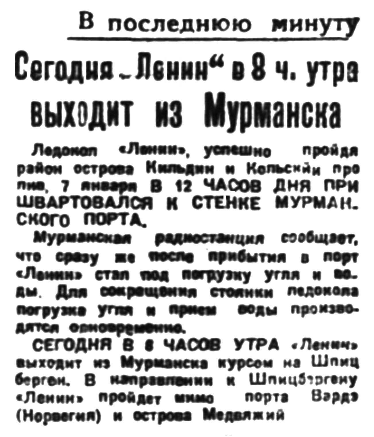 Мурманская радиостанция сообщает, что сразу же после прибытия в порт «Ленин» стал под погрузку угля и воды. Для сокращения стоянки ледокола погрузка угля и прием воды производятся одновременно.