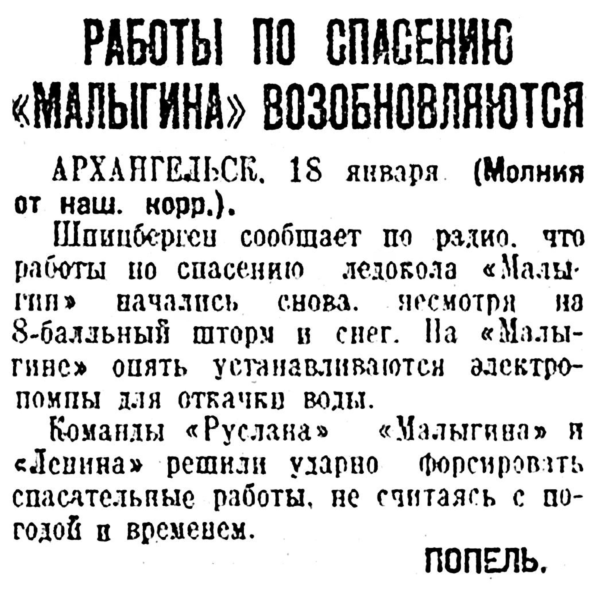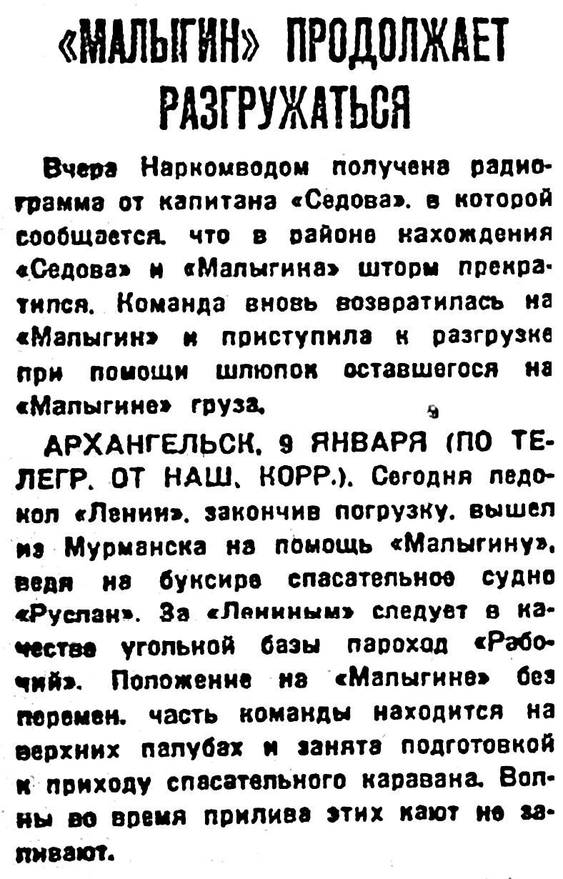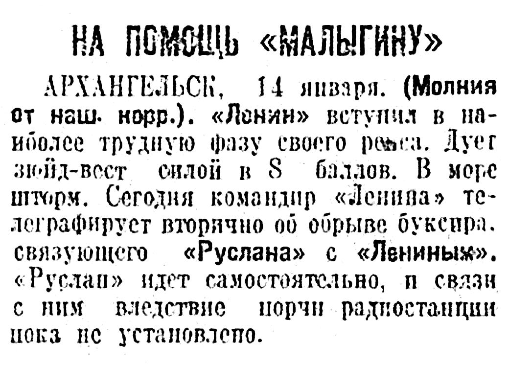 АРХАНГЕЛЬСК. 9 ЯНВАРЯ (ПО ТЕЛЕГР. ОТ НАШ. КОРР.). Сегодня ледокол «Ленин», закончив погрузку, вышел из Мурманска на помощь «Малыгину», ведя на буксире спасательное судно «Руслан». За «Лениным» следует в качестве угольной базы пароход «Рабочий». Положение на «Малыгине» без перемен, часть команды находится на верхних палубах и занята подготовкой к приходу спасательного каравана. Волны во время прилива этих кают не запивают.
