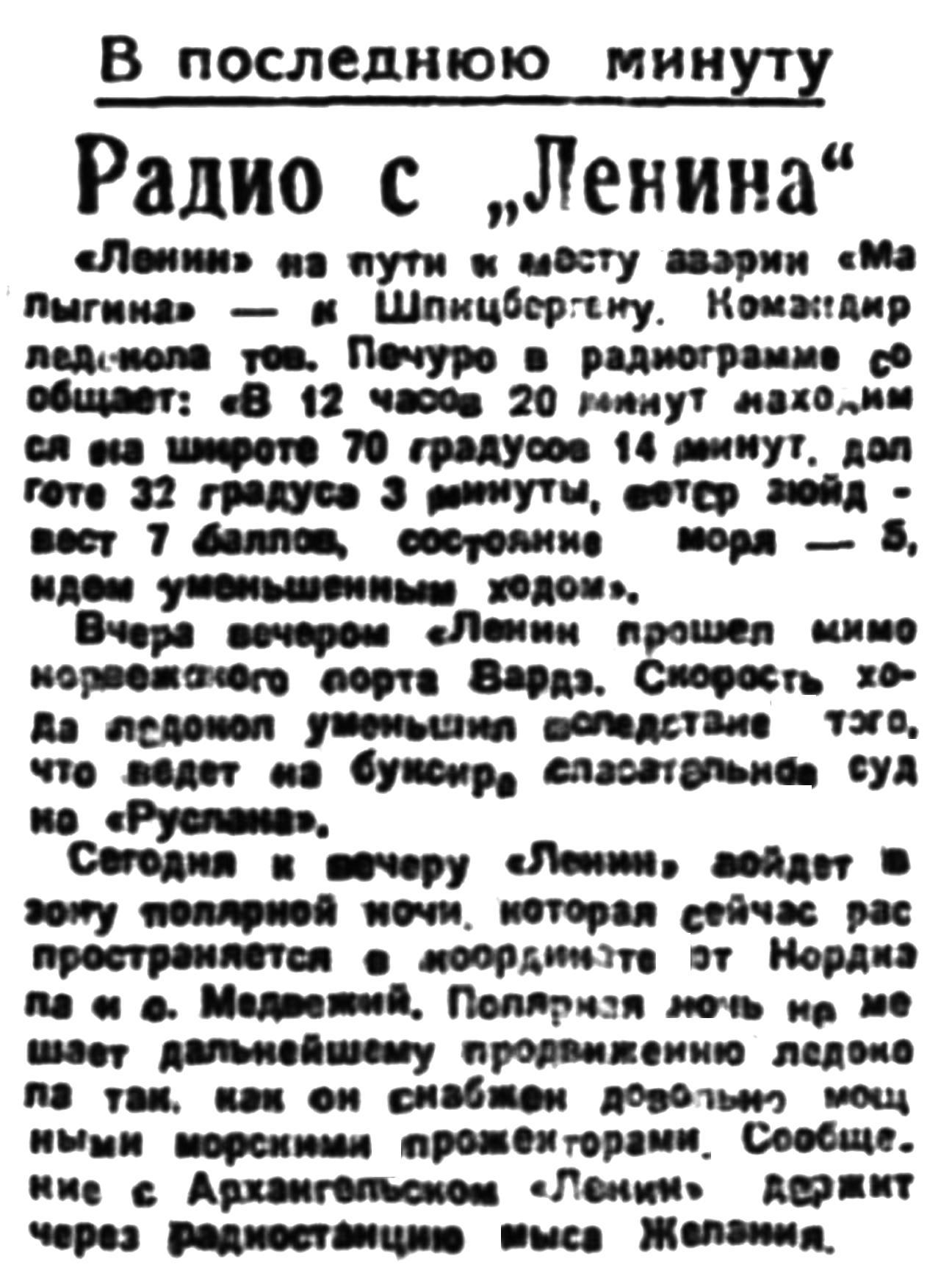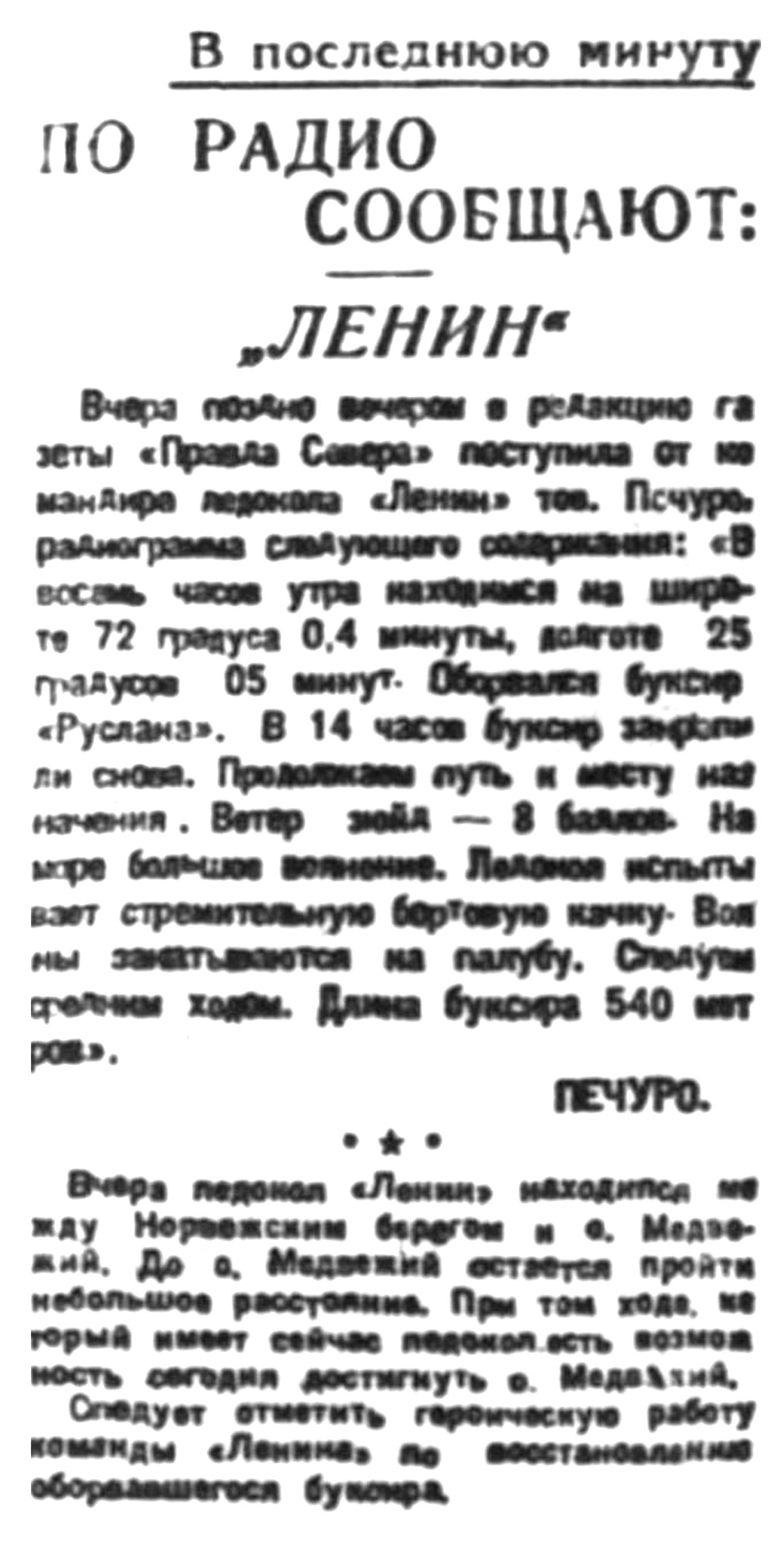 Вчера поздно вечером в редакцию газеты «Правда Севера» поступила от командира ледокола «Ленин» тов. Печуро, радиограмма следующего содержания: «В восемь часов утра находимся на широте 72 градуса 0.4 минуты, долгота 25 градусов 05 минут. Оборвался буксир «Руслана». В 14 часов буксир забросили снова. Продолжаем путь к месту назначения». Ветер зюйд — 8 баллов. На море большое волнение. Ледокол испытывает стремительную бортовую качку. Волны захлестываются на палубу. Следуем средним ходом. Длина буксира 540 метров.