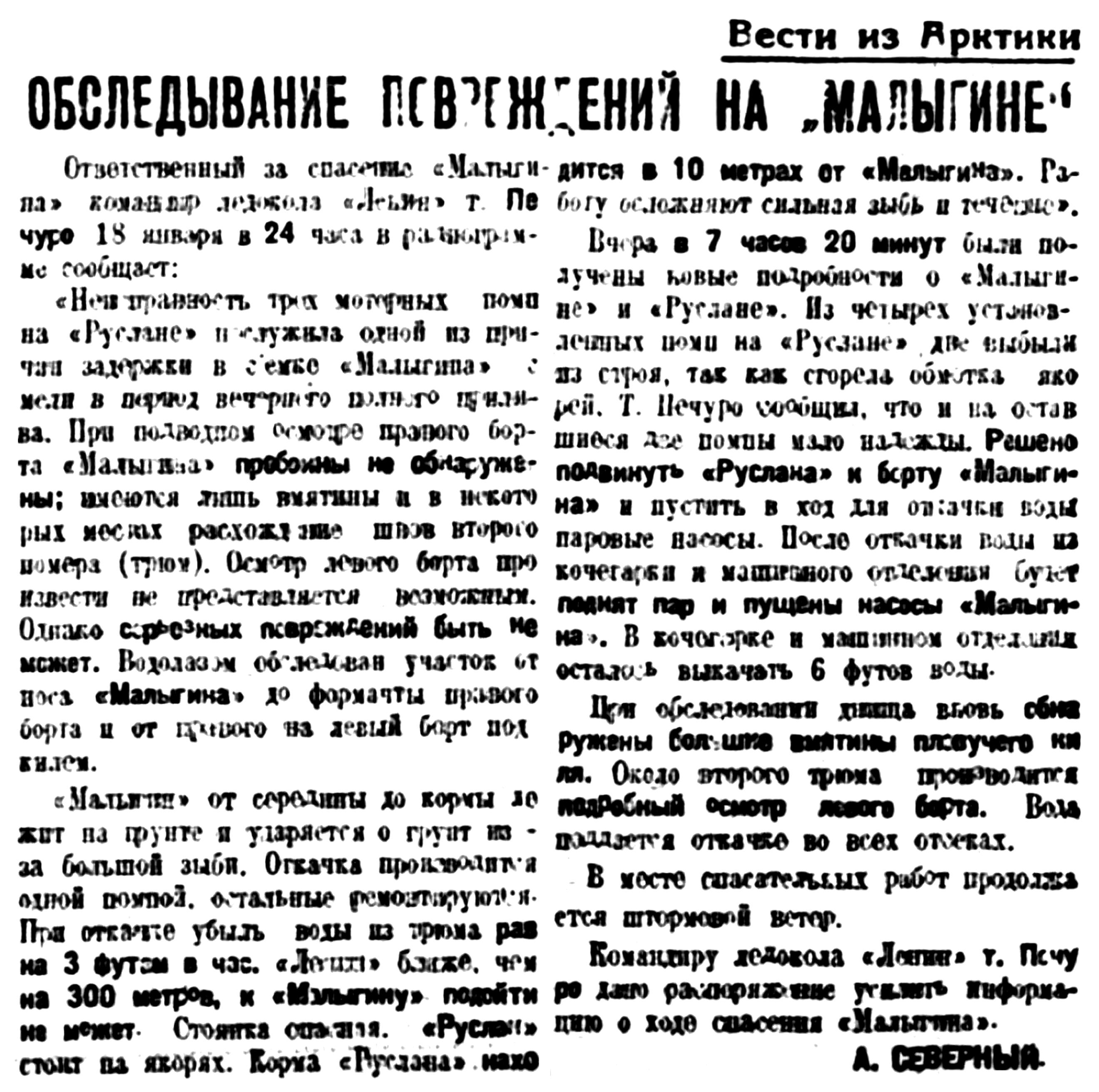Вчера в 7 часов 20 минут были получены новые подробности о «Малыгине» и «Руслане». Из четырёх установленных помп на «Руслане» две выбыли из строя, так как сгорела обмотка якорей. Т. Печуро сообщил, что и на оставшиеся две помпы мало надежды. Решено подвинуть «Руслана» к борту «Малыгина» и пустить в ход для откачки воды паровые насосы. После откачки воды из кочегарки и машинного отделения будет поднят пар и пущены насосы «Малыгина». В кочегарке и машинном отделениях осталось выкачать 6 футов воды. При обследовании днища вновь обнаружены большие вмятины пловучего киля. Около второго трюма производится подробный осмотр левого борта. Вода поддается откачке во всех отсеках.