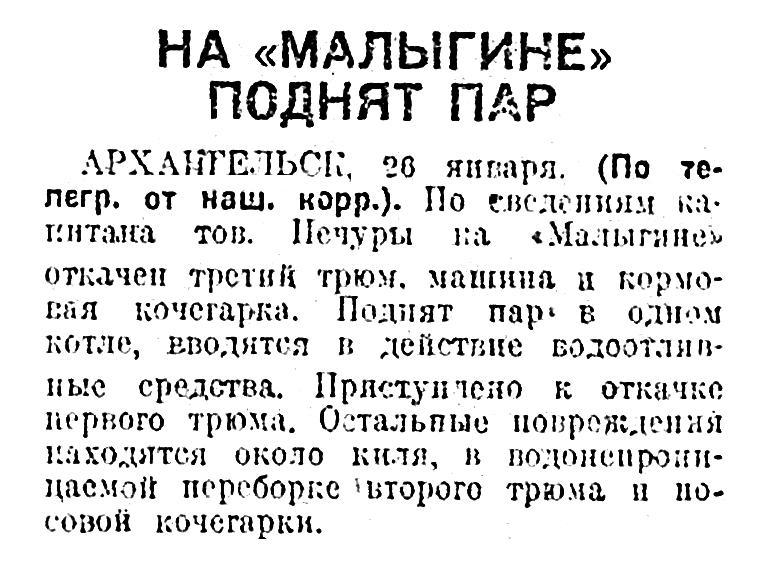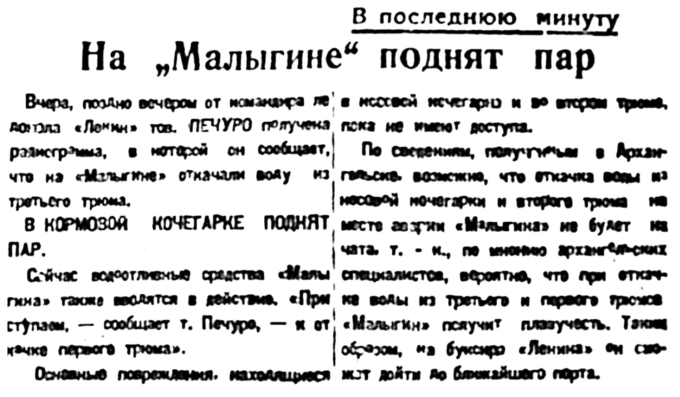 Основные повреждения, находящиеся в носовой кочегарке и во втором трюме, пока не имеют доступа. По сведениям, получаемым в Архангельске, возможно, что откачка воды из носовой кочегарки и второго трюма на месте аварии «Малыгина» не будет начата, т.-к., по мнению архангельских специалистов, вероятно, что при откачке воды из третьего и первого трюмов «Малыгин» получит плавучестъ. Такие образом, на буксире «Ленина» он сможет дойти до ближайшего порта.