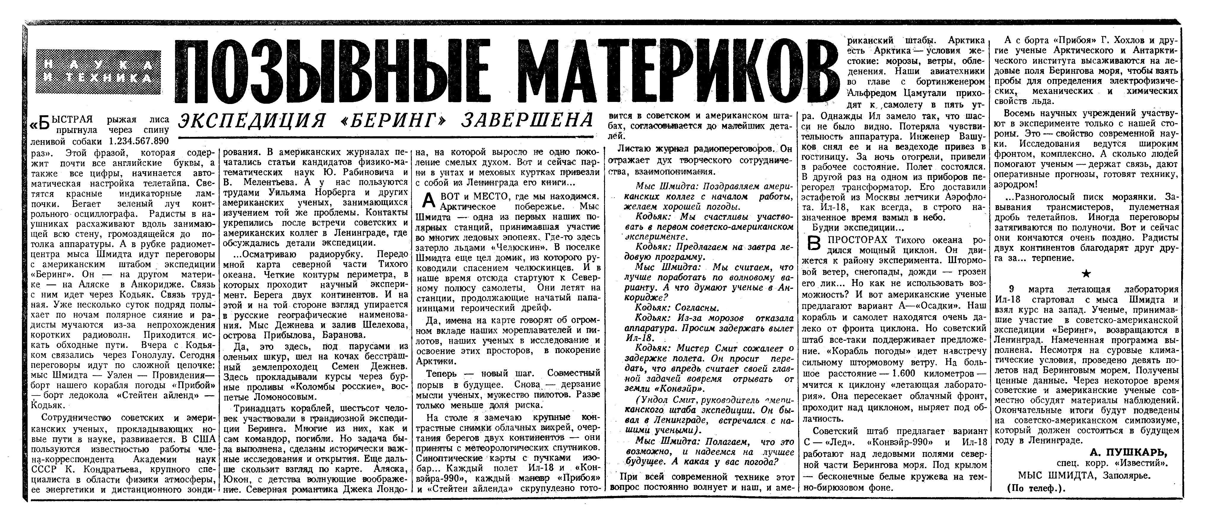 9 марта летающая лаборатория Ил-18 стартовал с мыса Шмидта и взял курс на запад. Ученые, принимавшие участие в советско-американской экспедиции «Беринг», возвращаются в Ленинград. Намеченная программа выполнена. Несмотря на суровые климатические условия, проведено девять полетов над Беринговым морем. Получены ценные данные. Через некоторое время советские и американские ученые совместно обсудят материалы наблюдений. Окончательные итоги будут подведены на советско-американском симпозиуме, который должен состояться в будущем году в Ленинграде.