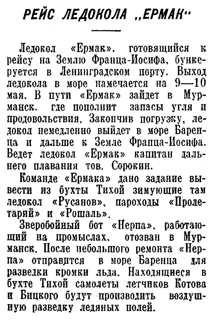 Ледокол «Ермак», готовящийся к рейсу на Землю Франца-Иосифа, бункеруется в Ленинградском порту. Выход ледокола в море намечается на 9—10 мая. В пути «Ермак» зайдет в Мурманск, где пополнит запасы угля и продовольствия. Закончив погрузку, ледокол немедленно выйдет в море Баренца и дальше к Земле Франца-Иосифа. Ведет ледокол «Ермак» капитан дальнего плавания тов. Сорокин.