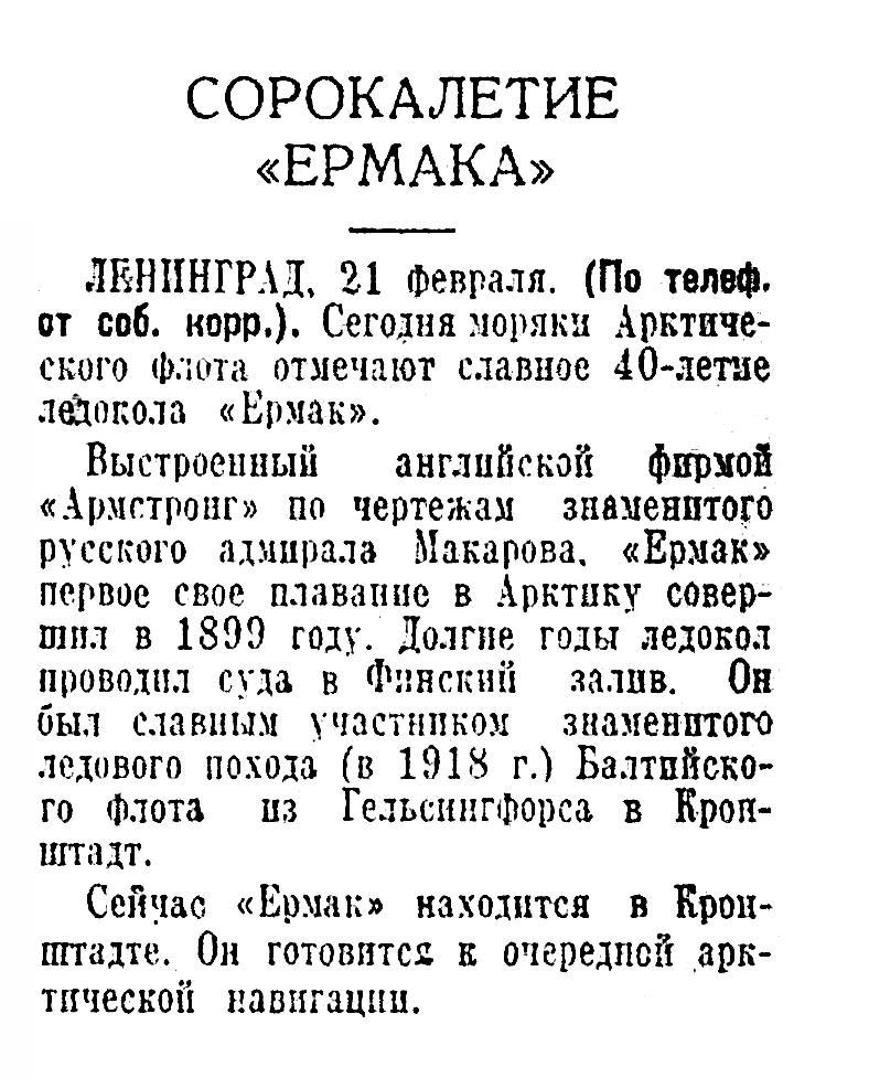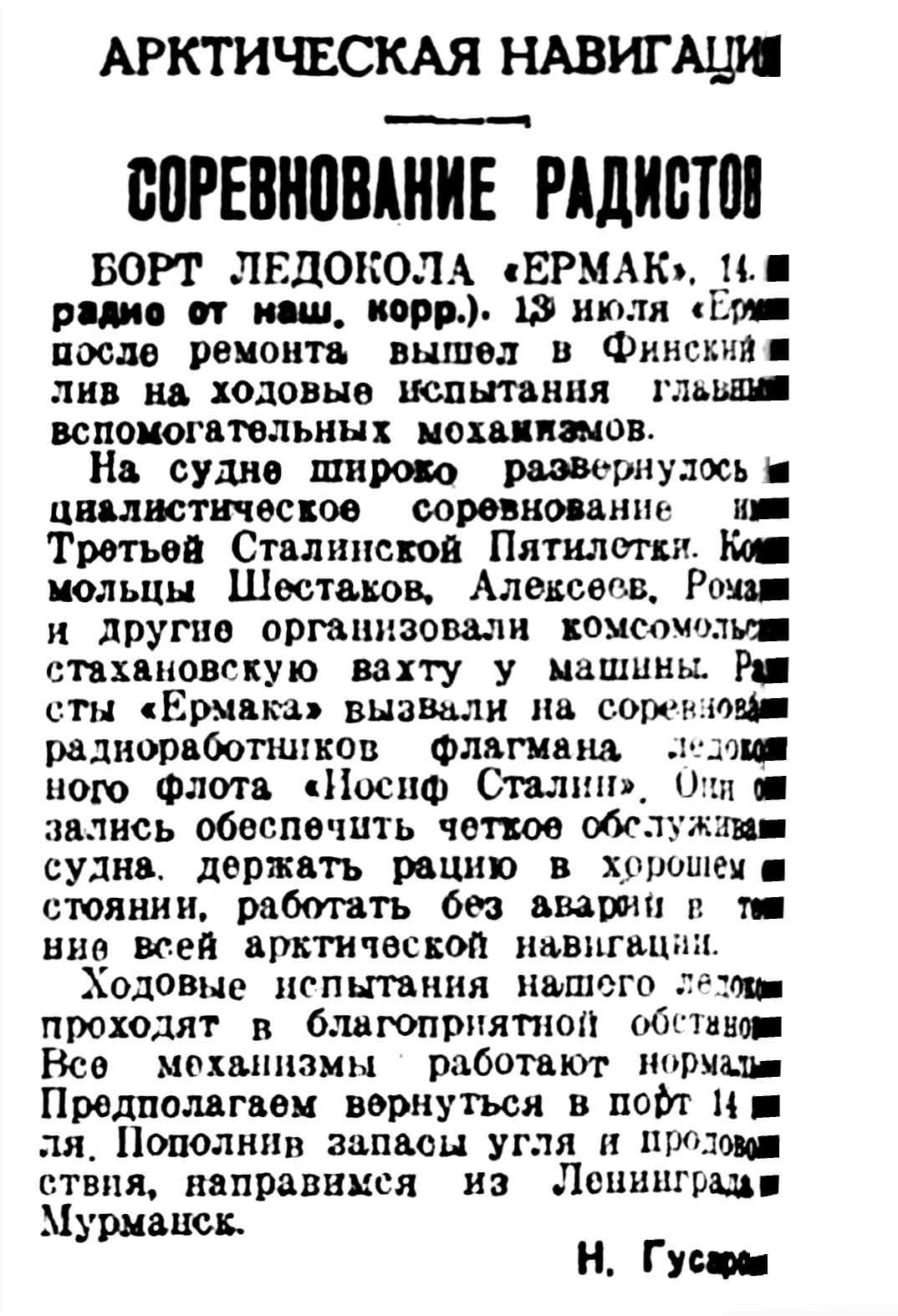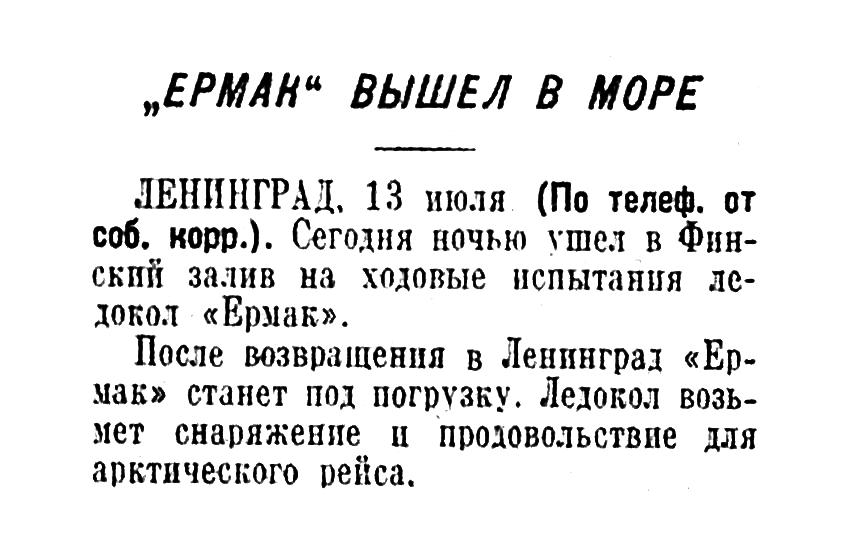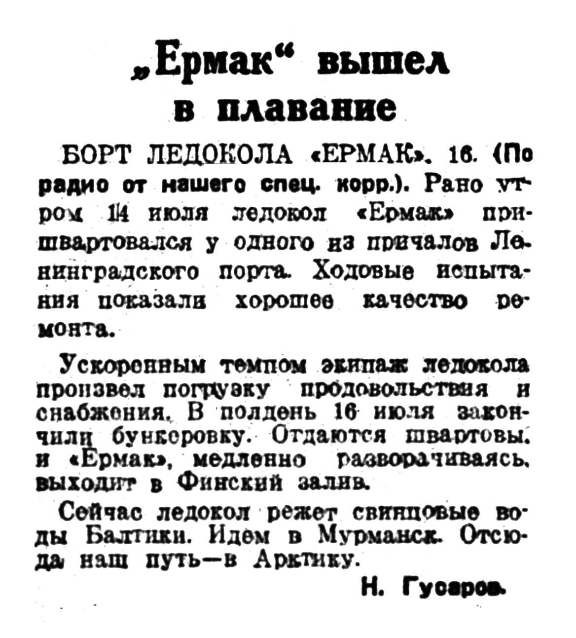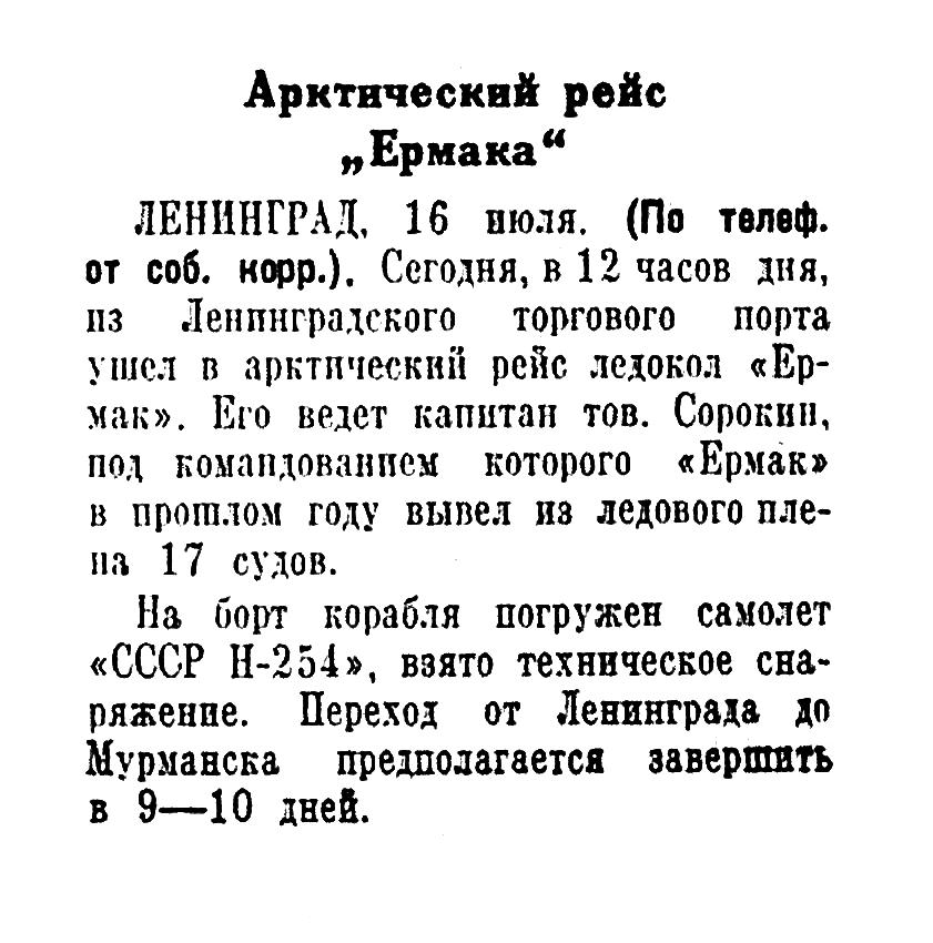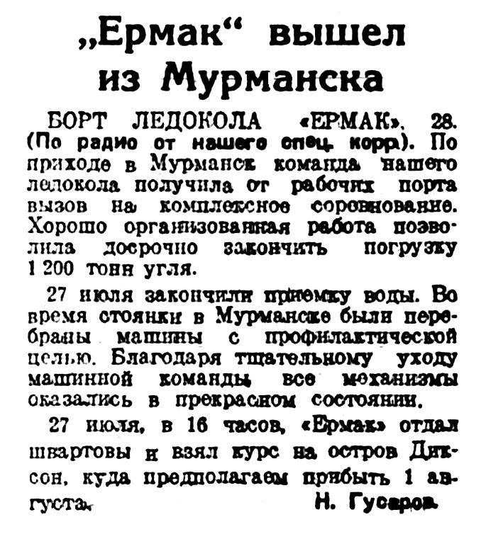 По радио от наш. спец. корр.). 17 августа «Ермак» взял курс на пролив Вилькицкого, где будет проводить гидрологические работы, связанные с освоением трассы Северного морского пути. Работы начались. Проводятся они группой гидрологов под руководством инженера-гидролога орденоносца тов. Мелешко.