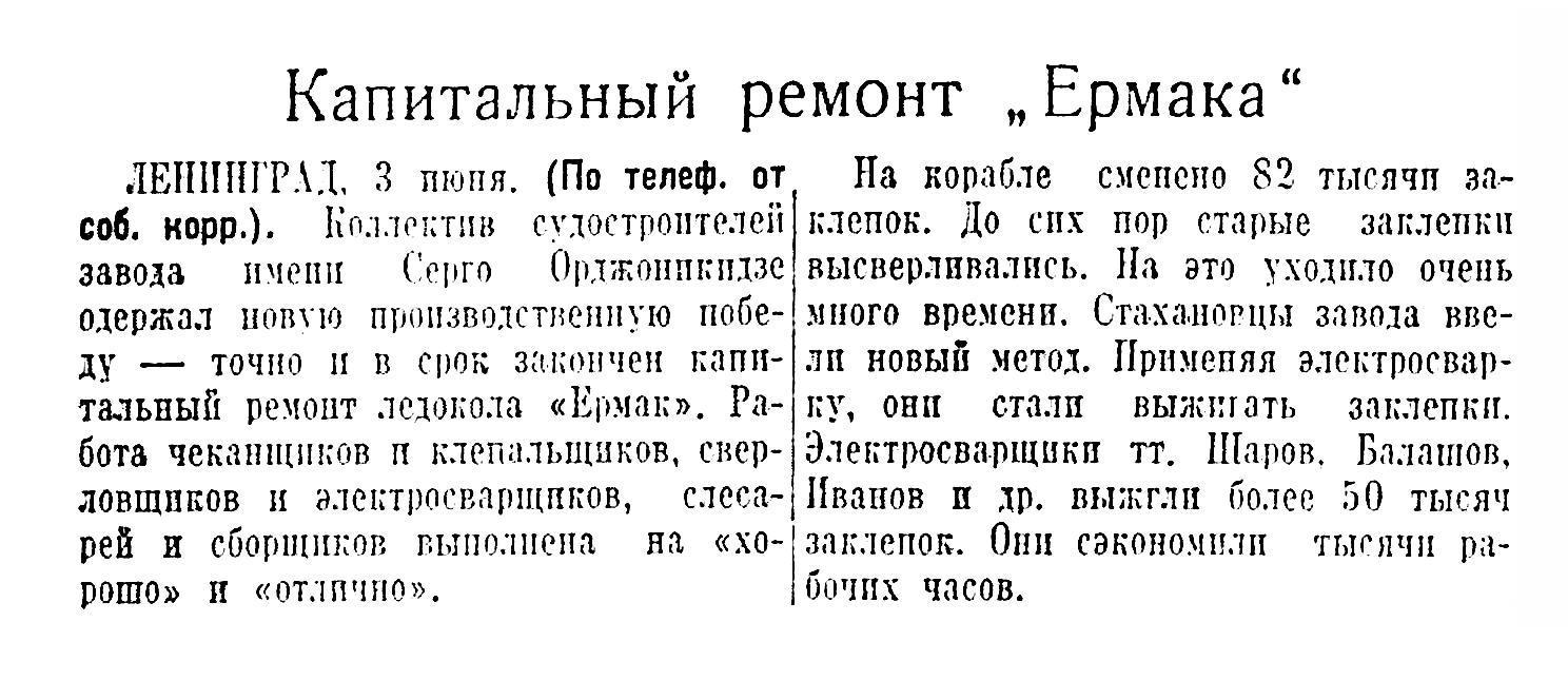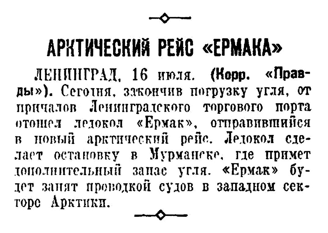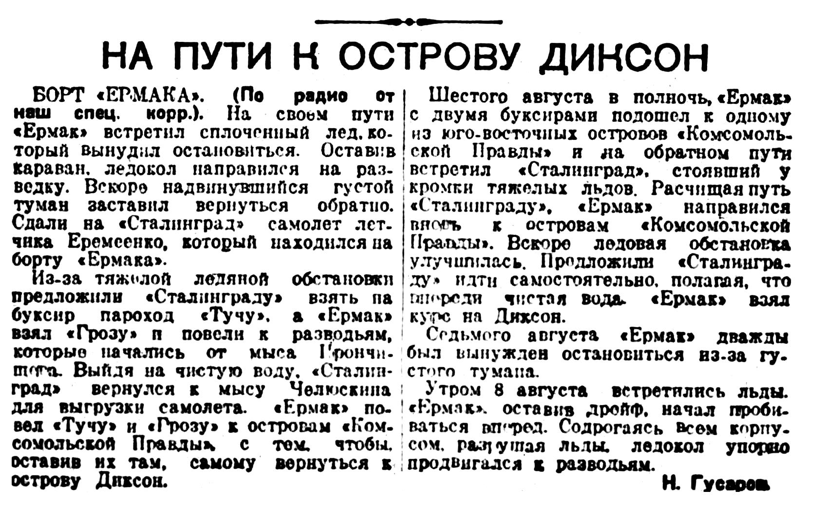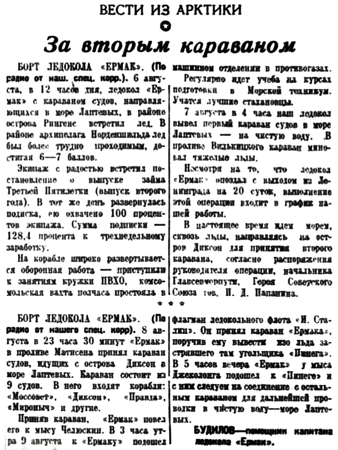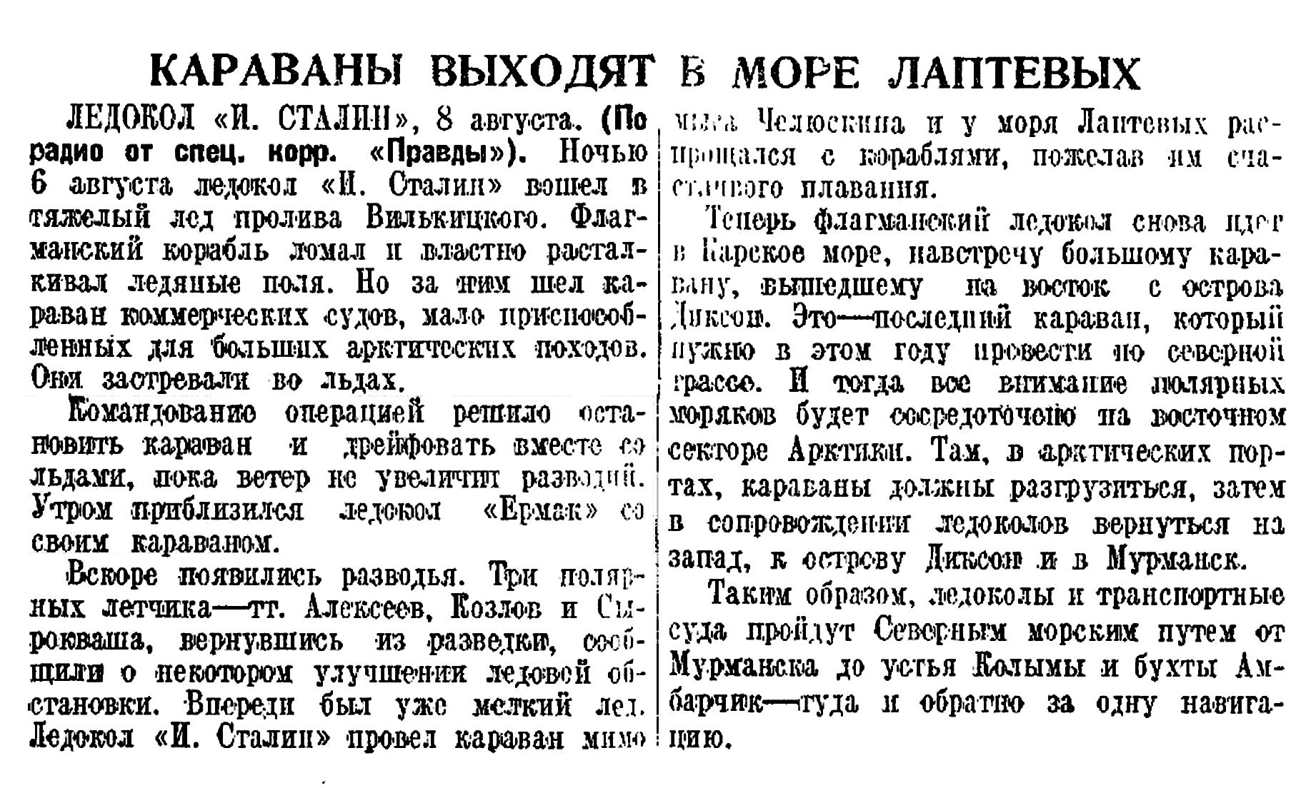 От наш. спец. корр.). Оставив второй караван судов, «Ермак» вернулся к островам «Комсомольской правды» для бункеровки. Караван следует самостоятельно на восток, до подхода к нему флагманского ледокола «Иосиф Сталин», который поведет их дальше в Восточпо-Сибирское море. Закончив приемку угля, «Ермак» до возвращения с востока судов будет работать у Ново-Сибирских островов.