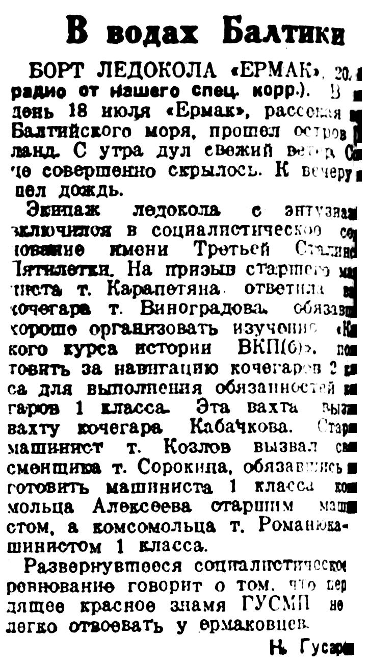 11 августа мы вернулись к архипелагу Норденшельда, где приняли от ледокола «Сталин» остальной караван — пароход «Моссовет», буксиры «Борец» и «Полярник». Получили задание от штаба проводки вывести караван на чистую воду в море Лаптевых, к проливу Санникова. Было дано задание на указанную операцию затратить 141 час. 14 августа в 15 часов вывели суда к указанной точке. Благодаря стахановской работе экипажа, задание выполнено на 55 часов раньше срока. В настоящее время, несмотря на запоздалый выход из Ленинграда, идем впереди графика на два дня.