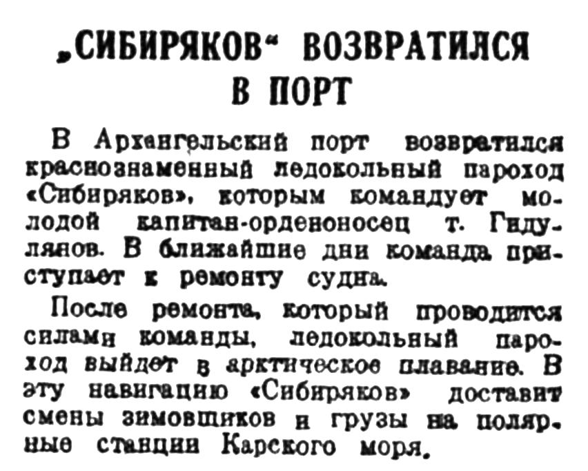 В Архангельский порт возвратился краснознаменный ледокольный пароход «Сибиряков», которым командует молодой капитан-орденоносец т. Гидулянов. В ближайшие дни команда приступает к ремонту судна. После ремонта, который проводится силами команды, ледокольный пароход выйдет в арктическое плавание. В эту навигацию «Сибиряков» доставит смены зимовщиков и грузы на полярные станции Карского моря.