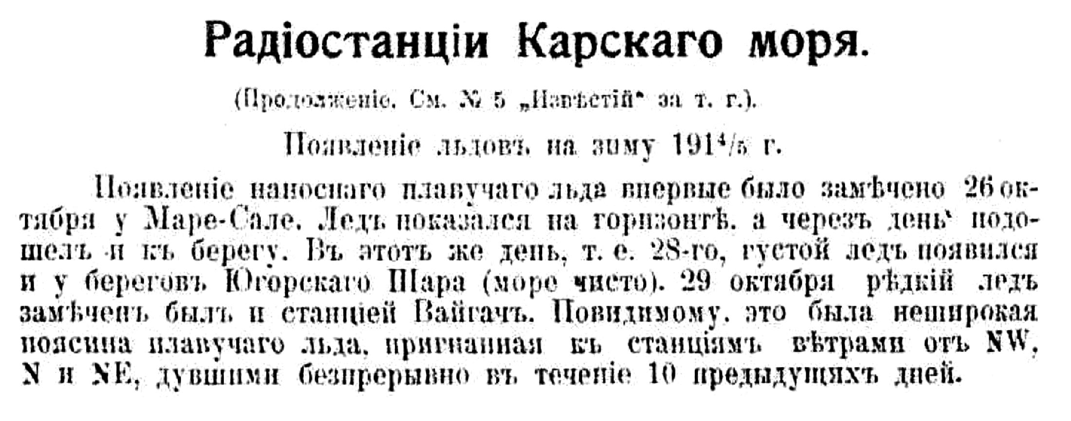 В начале июня 1914 г. Исакогорская радиостанция получила первую депешу с далекого Карского моря. Этим моментом закончился старый период плавания к устьям Сибирских рек, когда суда выходили из гавани совершенно неосведомленными, встретит ли их Карское море свободным от льда или покрытым непроходимыми ледяными полями и торосами. С этой даты мореплаватели, благодаря сведениям с радиостанции, имеют уже возможность предвидеть условия плавания и следовательно заранее решить: выходить-ли из порта сейчас-же и к какому проливу направлять свой путь, чтобы успешно пройти в Карское море, или же ожидать условий, благоприятствующих удалению льдов или даже совсемъ отложить плавание до следующего года.