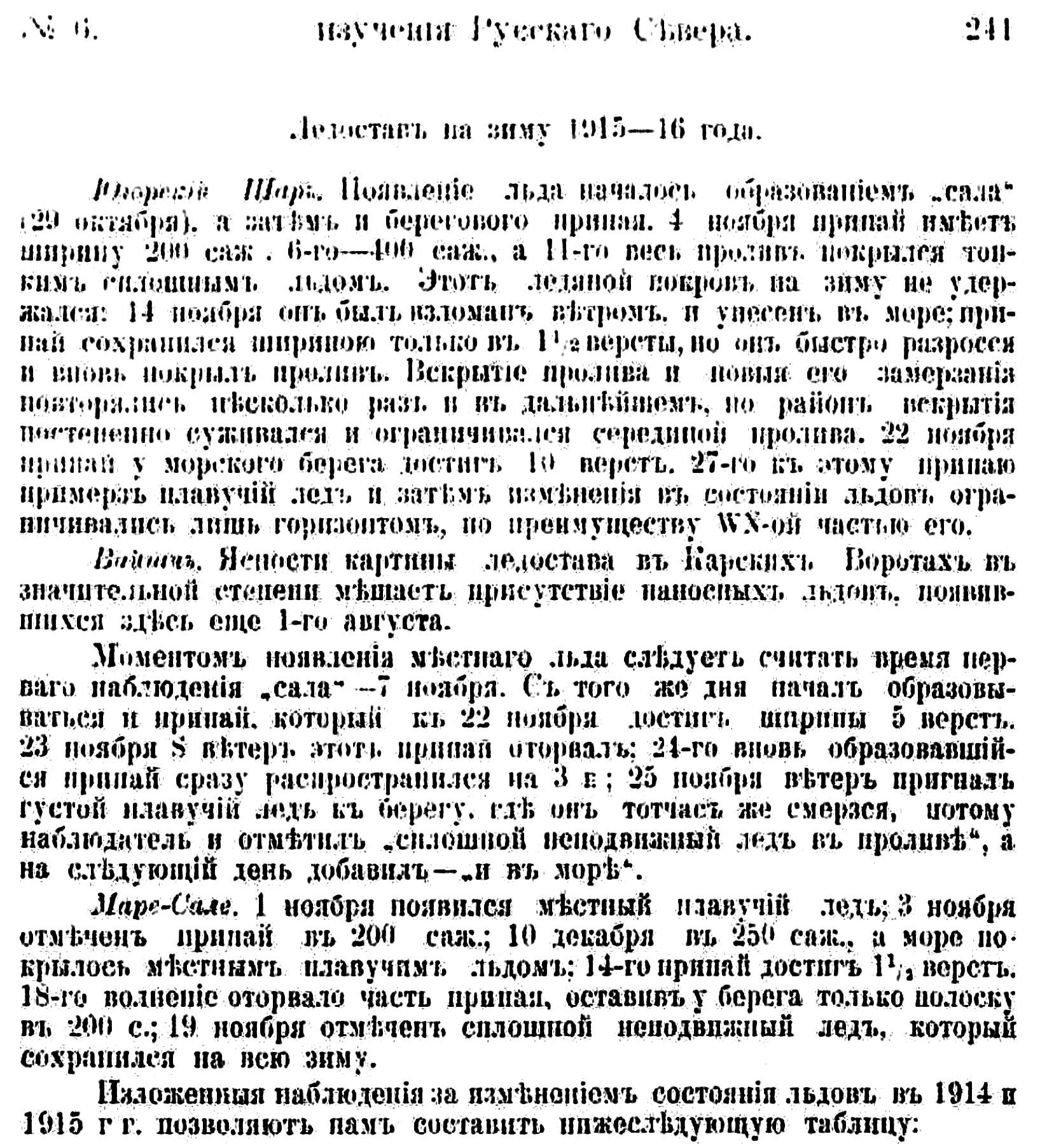 К настоящему времени, т. е. к началу 1916 г., наблюдатели Карского моря имели возможность проследить целиком две навигации, начиная от вскрытия проливов в 1914 г. до замерзания их на зиму 1915—16 года.