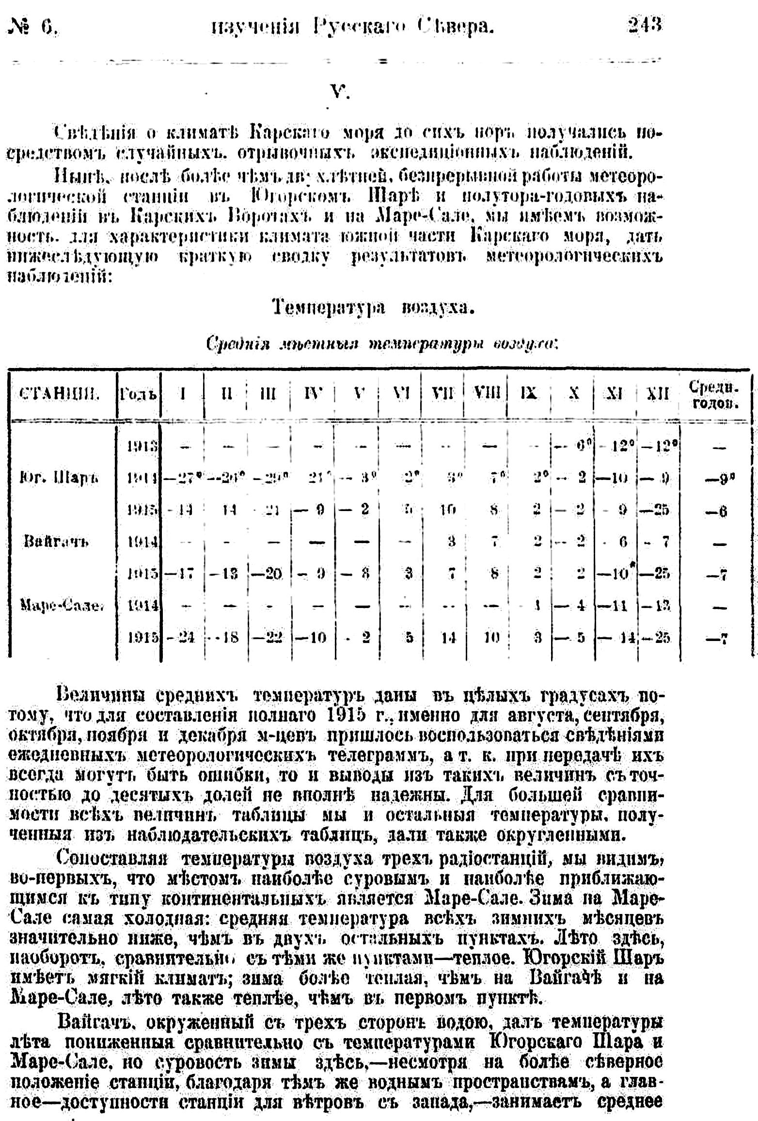 Метеорологические пункты при радиостанциях устроены еще в 1912 г. Д. Д. Рудневым, ездившим сюда вместе с почтово-телеграфной экспедицией по поручению Отдела Торговых Портов. Д. Д. Руднев установил метеорологические приборы в Югорском Шаре и на о. Вайгач. Но наблюдения здесь начались позже: в Югорском Шаре с сентября 1913 г., а на Вайгаче с августа 1914 г. На Маре-сале приборы установлены в сентябре 1914 г. командированными центральной гидрометеорологической станцией (в Архангельске ) В. А. Березкиным и автором настоящей статьи.