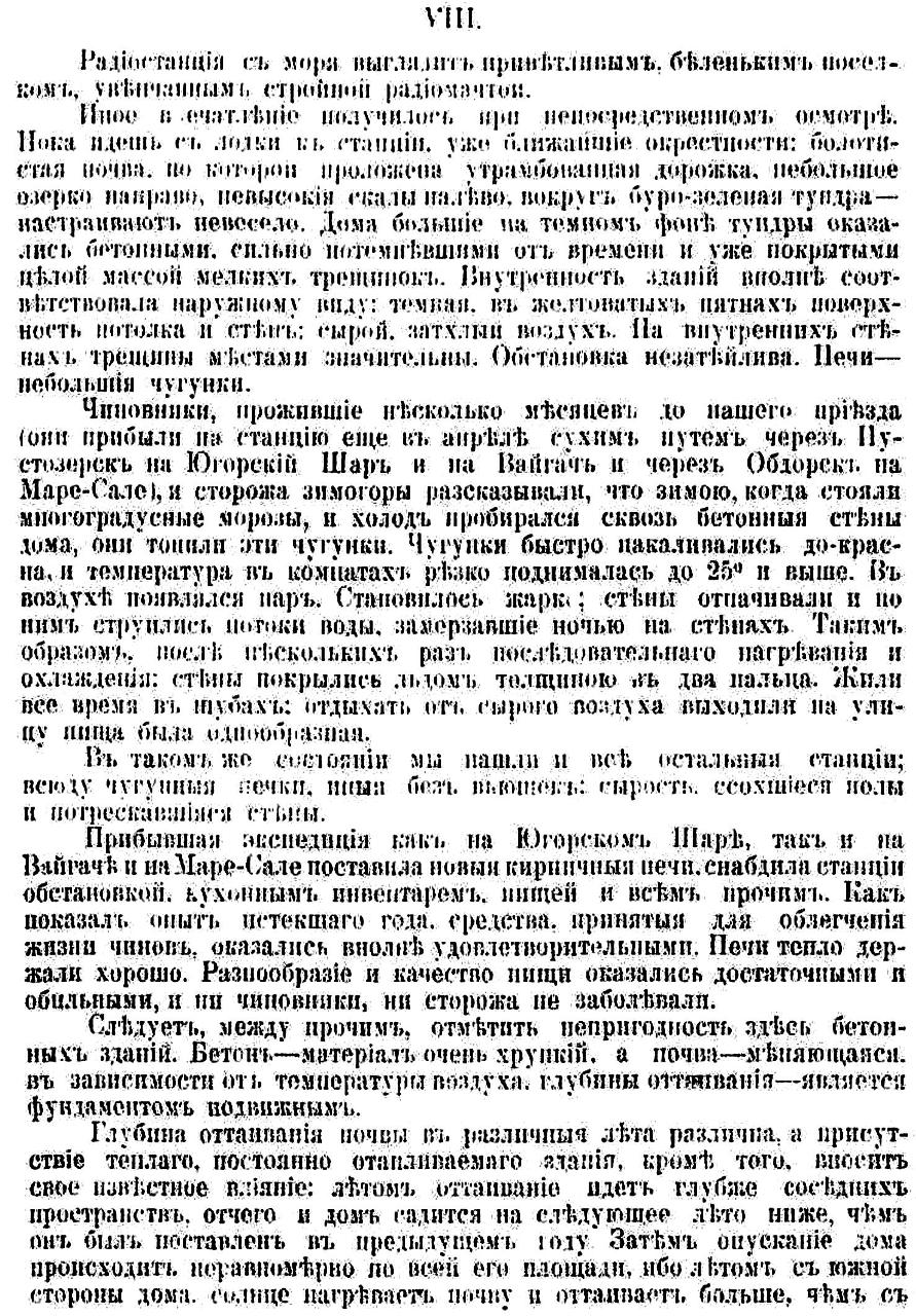 Чиновники, прожившие несколько месяцев до нашего приезда (они прибыли на станцию еще в апреле сухим путем через Пустозерск на Югорский Шар и на Вайгач и через Обдорск на Маре-Сале), и сторожа зимогоры рассказывали, что зимою, когда стоили многоградусные морозы, и холод пробирался сквозь бетонный стены дома, они топили эти чугунки. Чугунки быстро накаливались до-красна, и температура в комнатах резко поднималась до 25° и выше. В воздухе появлялся пар. Становилось жарко: стены отпачивали и по ним струились потоки воды: замерзавшие ночью на стенах. Таким образом, после нескольких раз последовательного нагревания и охлаждения: стены покрылись льдом толщиною в два пальца. Жили все время в шубах: отдыхать от сырого воздуха выходили на улицу, пища была однообразная.